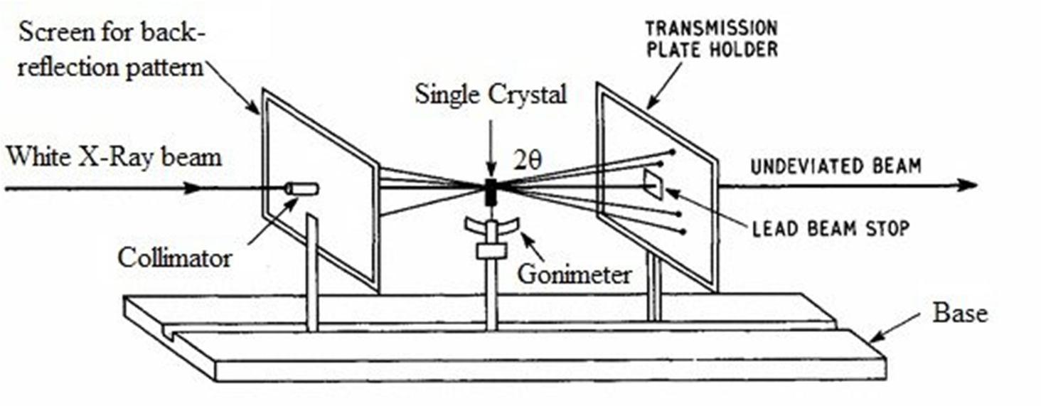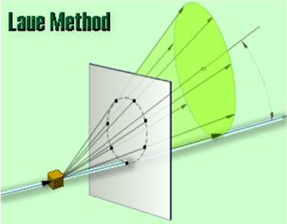 In the transmission Laue method, the film is placed behind the crystal to record beams which are transmitted through the crystal. One side of the cone of Laue reflections is defined by the transmitted beam. The film intersects the cone, with the diffraction spots generally lying on an ellipse.