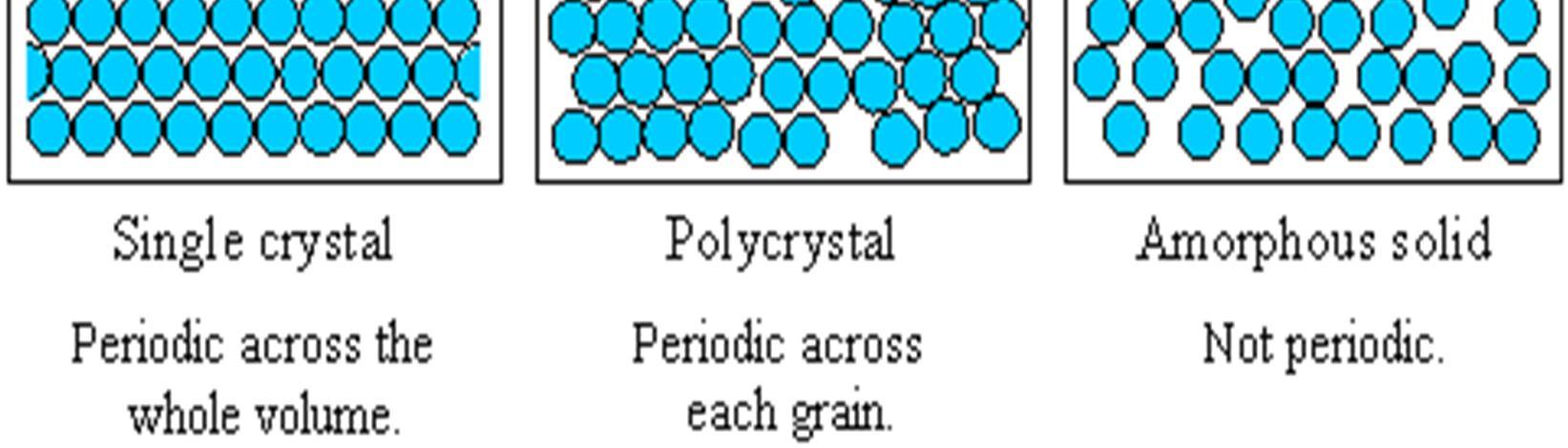 The fundamental difference between single crystal, polycrystalline and amorphous solids is the length scale over which the atoms are related to one another by translational symmetry i.e. periodicity or long range order. Single crystals have infinite periodicity, polycrystals have local periodicity, and amorphous solids have no long range order.