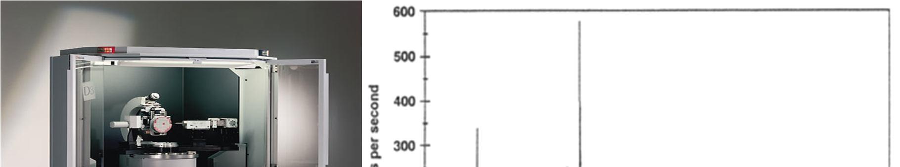 The Laue method is mainly used to determine the orientation of large single crystals. By the incident, radiation is reflected from, or transmitted through, a fixed crystal. It provides information about the structure of an area with a diameter of about 1.5 mm. Laue diffraction pattern, in X rays, a regular array of spots on a photographic emulsion resulting from X rays scattered by certain groups of parallel atomic planes within a crystal. When a thin, pencil like beam of X rays is allowed to impinge on a crystal, those of certain wavelengths will be oriented at just the proper angle to a group of atomic planes so that they will combine in phase to produce intense, regularly spaced spots on a film or plate centered around the central image from the beam, which passes through without scattering. To carry out the measurements, the test sample is placed in a special installation, called a diffractometer. The diffractometer schemes to obtain the diffractograms by the Bragg method. The crystal is located on a so called goniometer, a device that allows rotating both the crystal and detector, accurately counting the angles and distances. The goniometer ensures a simultaneous rotation of the sample by an angle θ and rotation of the detector by an angle of 2θ. A typical diffractogram is shown.