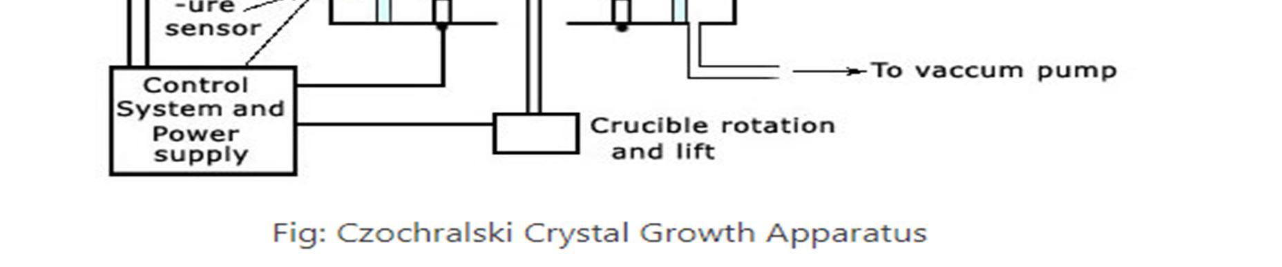 1) Czochralski Process: This process was invented by polish scientist Jan Czochralski in 1915. The idea of the Czochralski method is based on pulling a crystal from the melt against gravity forces. The Czochralski process is a well established method for growing large scale single crystals of semiconductors, metals, salts, and gemstones. The most important use of this method is the growth of semiconductors, particularly that of single crystalline silicon, which cannot easily be grown using other methods. Silicon is a particularly important material because it has many desirable properties; it is abundant and cheap, reliable and its semiconducting properties are excellent. In the Czochralski process shape of the crystal is free from the constraint of the shape of the crucible. In this method, the charge is melted and maintained at a temperature slightly above the melting point. The pulling rod is lowered to just touch the melt. Since the rod is at a lower temperature compared to the melt crystallization occurs at the pointed tip of the pulling rod. The crystal is pulled slowly. The rate of pulling varies on factors like thermal conductivity, latent heat of fusion of charge, and rate of cooling of the pulling rod. The seed is rotated to keep the grown crystal uniform and cylindrical.