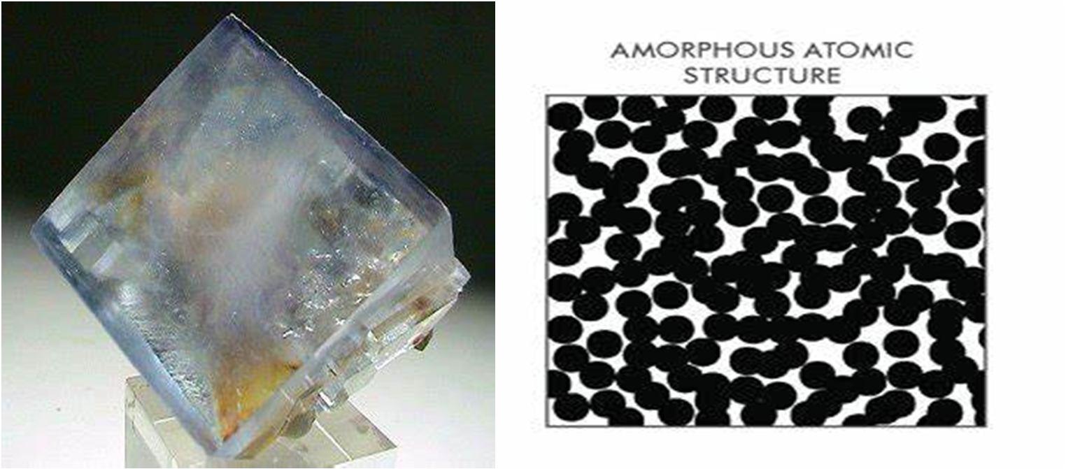 Amorphous solids, lacking the three dimensional long range order of a crystalline material, possess a more random arrangement of molecules, exhibit short range order over a few molecular dimensions, and have physical properties quite different from those of their corresponding crystalline states. Amorphous solids resemble liquids in that they do not have an orderly arrangement of atoms or ions in a three dimensional structure. These solids do not have a sharp melting point and the solid to liquid transformation occurs over a range of temperatures. The physical properties exhibited by amorphous solids are generally isotropic as the properties do not depend on the direction of measurement and show the same magnitude in different directions.