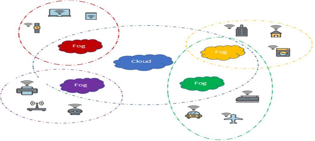 Fog computing, as shown in figure1, associates several traditional components, e.g. routers, switches, set top boxes, proxy servers, base stations (BS), etc., to create a network coverage for fog computing. Those components are placed closer to end users and far from cloud computing and are also placed in a distributed manner between them. Consequently, Fog creates a large geographical distribution of cloud based services near IoT devices and sensors. The communication between Fog nodes is done with WIFI technology in most cases. This last provision provides mobility and interoperability features to the Fog nodes [17].