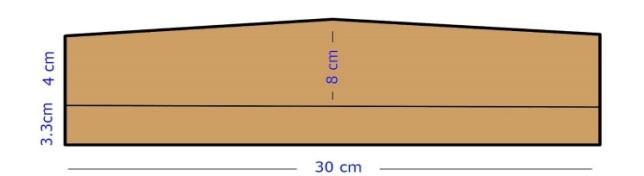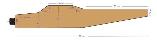 Elevators are flight control surfaces, usually located at the rear end of an aircraft, which control the pitch of the aircraft and along with the angle of attack and the lift of the wing. The design of the elevator is as shown in Fig 6.4 Rudder is a flight control surface, usually located at the rear of an aircraft, which control the yaw of the aircraft. Wing is an airfoil that helps lift a heavier-than-air craft. When positioned above the fuselage (high wings), wings provide an unrestricted view below and good lateral stability. The design and view of the Rudder is shown Fig. 6.5 and wing measurements are shown in Fig. 6.6