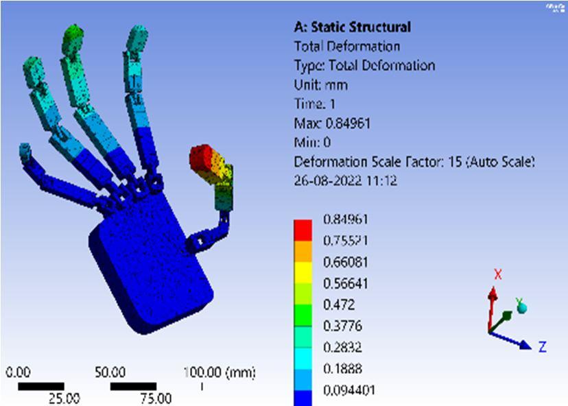 The deformation of the total hand model at 50N force for Al Alloy is presented in figure 8. The blue colour indicates the minimum value and the red colour indicates the maximum value.