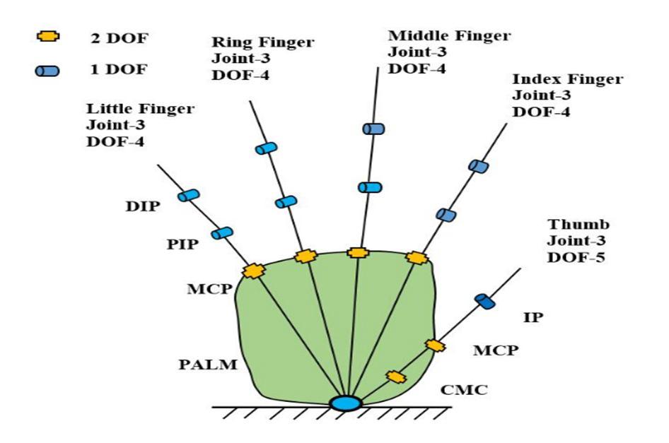 The projected robotic hand comprises of 4 fingers and a thumb. Each finger consists of three phalanges. Each finger consists of three joints i.e.PIP, DIP and MCP joints. The thumb consists of CMC.MCP and IP joints. The index finger has 4 degrees of freedom. The ring, middle and index fingers have 4 degrees of freedom each. The thumb comprises of 5 degrees of freedom. The schematic diagram of the hand model with all the phalanges, joints and degrees of freedom are presented in fig.1.