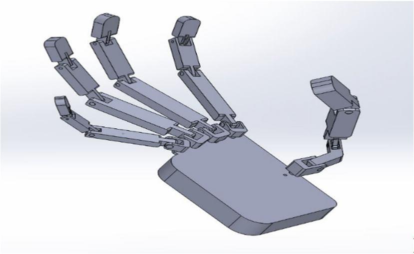 The dimension of all the phalanges of the proposed hand are stated in table 2.The proposed hand has a palm, a thumb and four fingers as similar to a human hand. The fingers are attached to the base of the palm. The fingers consist of three phalangs each. All the phalanges of a single finger are connected to each other by means of revolute joints. The model is built by considering the anthropomorphic data of the size of a normal male human being[25] mentioned