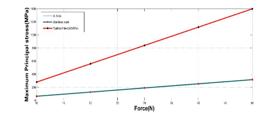 The comparison graph for the maximum principal stress is described in figure 15. It is found that as the value of the force increases the stress value also increases. The stress value for the Aluminum alloy and stainless steel are approximately same and are align in a single line. The slope of the stress value for carbon fiber 395 GPa is more as compared to the other two material which is indicated in red line.
