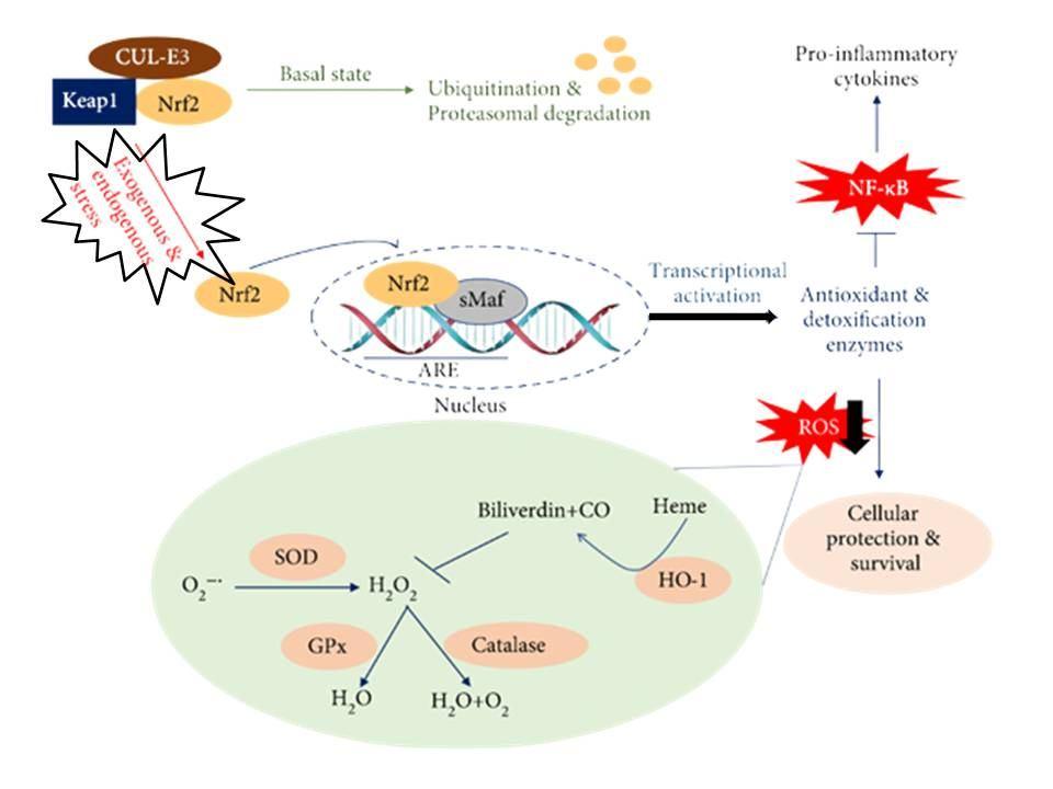 Figure 2- Nrf2 activity is augmented by exogenous and/or endogenous stressors. Keap1 functions as an adapter molecule for CULE3 ligase to mediate Nrf2 ubiquitination and subsequent proteasomal destruction under normal circumstances. When xenobiotics and/or ROS, which are external and/or endogenous stressors, are present, Nrf2 moves into the nucleus and binds to the ARE, activating cytoprotective molecules such as antioxidant and detoxifying enzymes. The generation of hydrogen peroxide is mediated by superoxide dismutase (SOD), which breaks down superoxide radicals (O2) (H2O2). The breakdown of H2O2 is catalysed by the enzymes catalase and glutathione peroxidase (GPx). The potential antioxidants biliverdin and bilirubin are produced when heme is degraded by HO [21, 22]