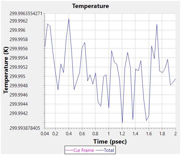 Figure 6- The Temperature graph is calculated with 200MD steps with NVT ensemble with initial temperature 300K with cut off radius 14.0Å with FMM method that calculates long distance Coulomb forces.