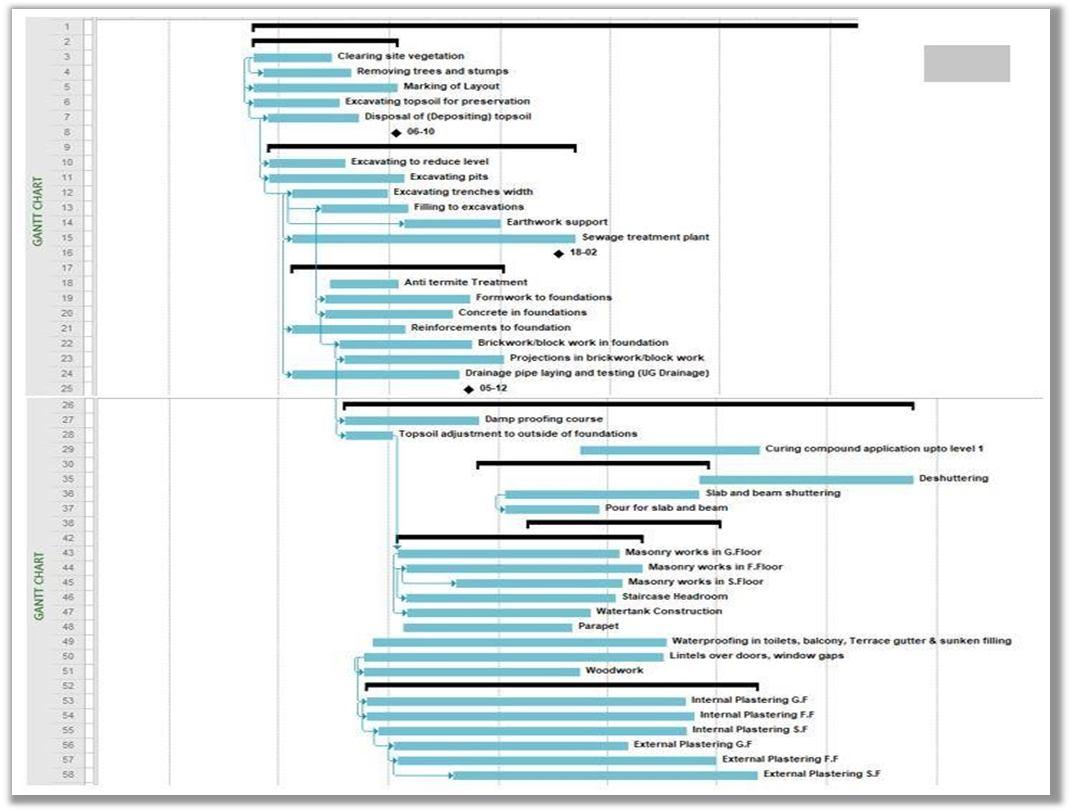 A Gantt chart is used to create the project schedule for identifying the order of construction. These activities were given resources (manpower). Resource levelling has been done after considering the actual resources that are accessible on the construction site.