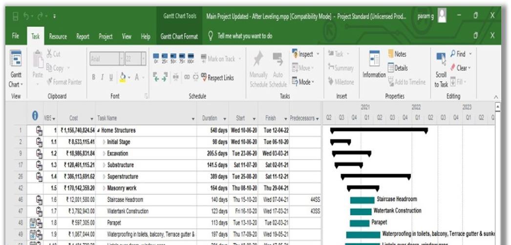 Following the collection of drawings and the creation of an activity list, the quantity for each and every activity has been determined. The next step is to schedule the tasks using the MS Project software. Following is the scheduling process: Making a new project plan, assigning a calendar, setting project information, entering task, establishing WBS, scheduling activities, resource allocation and leveling in MS Project are all steps in the process.