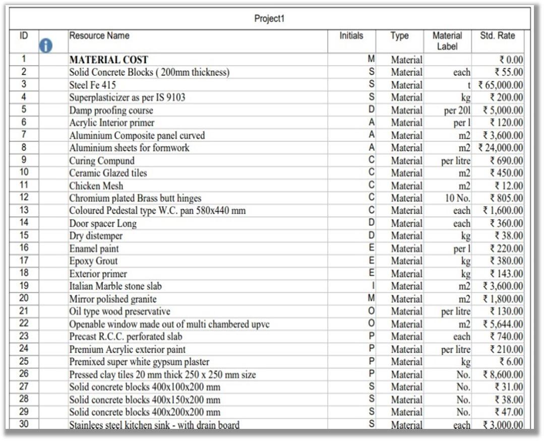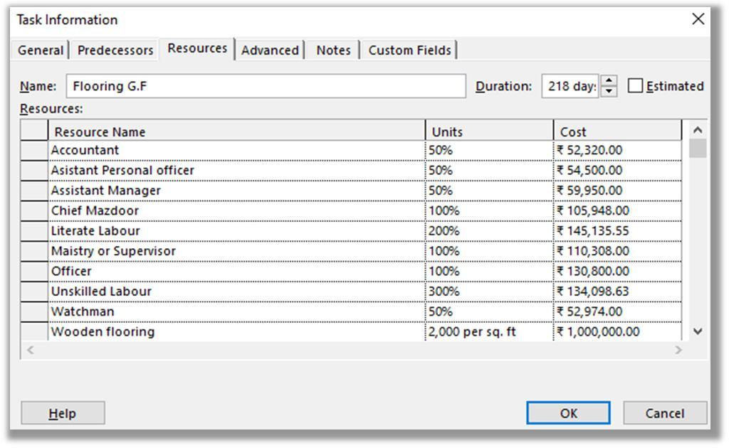 is only available for resources of the work type. The estimated cost for all the activities and for the entire project is then determined. This job is completed utilising Analysis of Rate CPWD. Figure 3 and Figure 4 shows the resource allocation for Ground floor flooring. Similiarly, for all the other activities