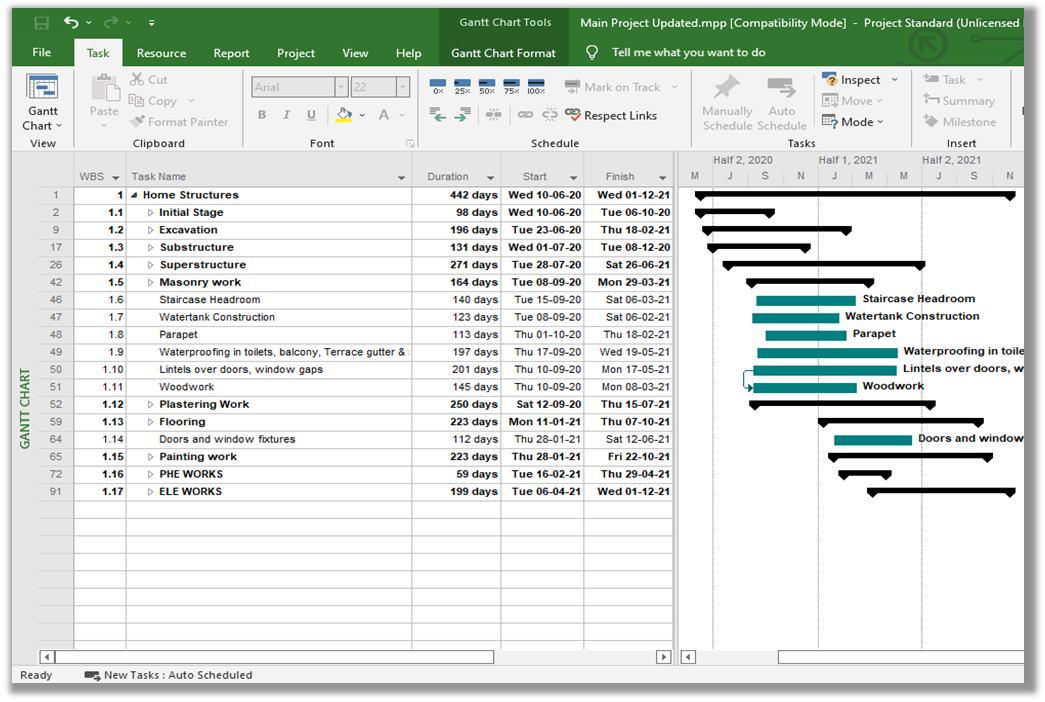 A WBS shows the hierarchy of a project's component parts. Using the work breakdown structure, a project called home structures is created. This creates various other activities in sequence inside of it. Project breakdown structures such as excavation and earthwork, foundation, superstructure, reinforcement, concreting, brick work including doors and windows frame, lintel work, interior plaster, waterproofing work, external plaster, finishing work, painting and service work are then produced inside this home structures. Figure 2 shows the WBS for the entire project.