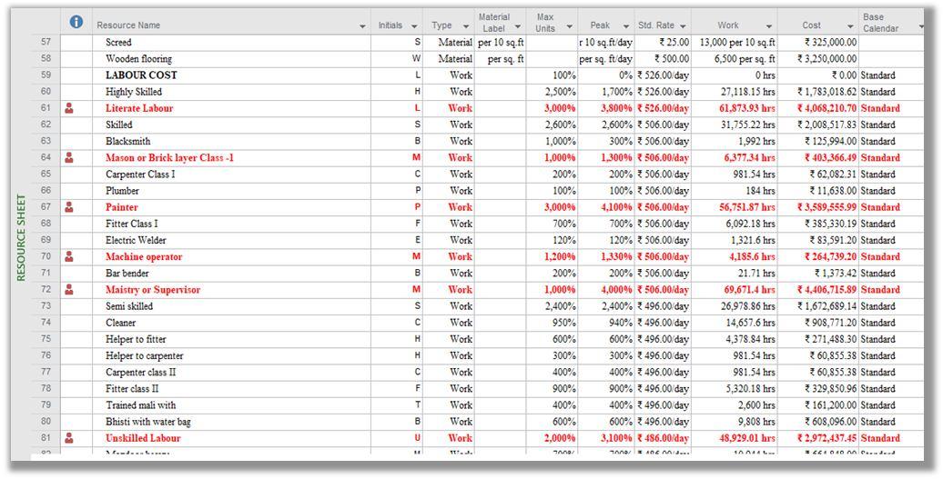 2) Resources such as manpower, material and machinery are allocated for each and every activity according to the requirement. The overallocated resources are Assisstant Personal Officer, Painter, Tractor Trolley, Supervisor, Machine Operator, Manager Personal, Unskilled labour, Maistry/Supervisor, Mason, Lietrate Labour