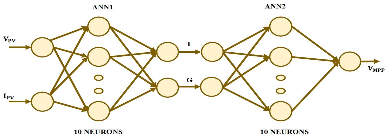 The suggested technique integrates to cascaded ANN to assess the voltage where maximum power is achieved with reading the current and voltage signals. The current and voltage signals of the array acts as the inputs to ANN1. ANN1, the neural network one, is equipped to forecast irradiance and the temperature that are to be treated as input to ANN2, the second neural network.