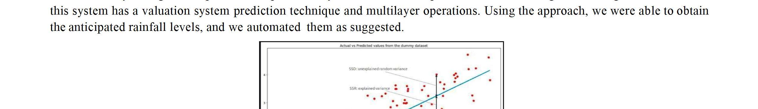 5) Multiple linear Regression: Is the process of creating a regression model to forecast the dependent variable using a large number of independent variables (rainfall). The model assumes a linear relationship between the independent factors and the dependent variable. The magnitude and axis of the connection between the independent variables and rainfall are displayed in the model's coefficients. Statistics like R-squared and modified R-squared can be used to evaluate the model's accuracy.
