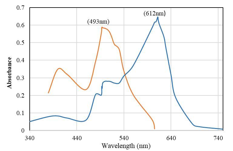 Fig.2. maximum wavelength of dye solutions (Orange dye= 493 nm, Blue dye= 612 nm)