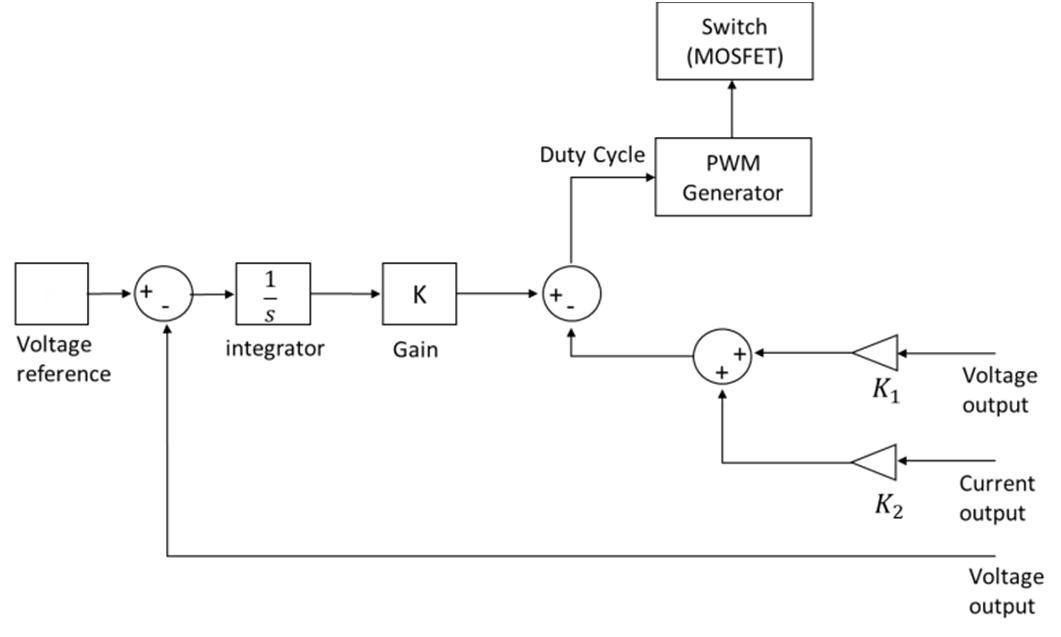 In accordance with the objectives of this research, the control system is used to adjust the PWM duty cycle on the Boost Converter. The research utilizes two control strategies: LQR and integral state feedback. A state-space model = + will depict the regulated system. The proposed model of the control system is presented in Fig 2. The fundamental idea behind this control system is to add an integrator to the feedforward path between the PWM generator and the error comparator resulting from comparing the output voltage of the boost converter to the reference voltage.
