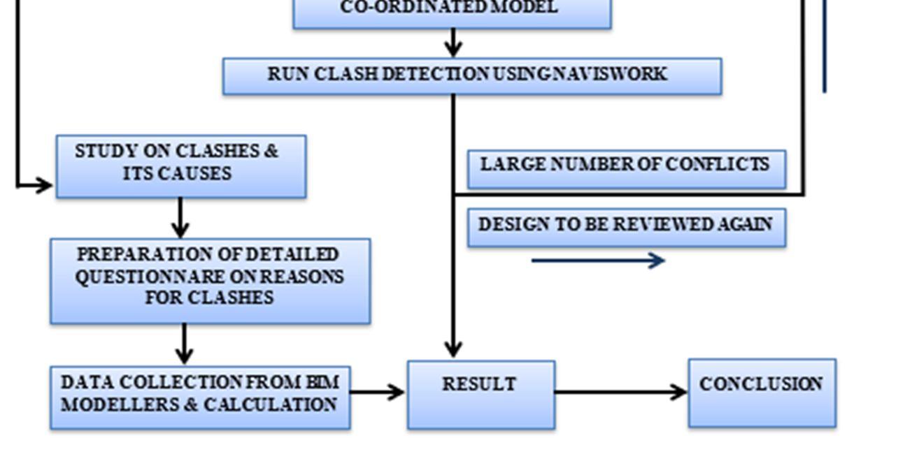 If the respondents in the initial sample group of 100 who did not answer to the survey had different viewpoints from those who did (46), there may have been an elevated likelihood of a non response bias. Under such conditions, extrapolating the results beyond the study's sample is frequently impossible. It was then validated by implementation on a case study of a significant Residential project. The schema involved identifying conflicts, categorizing conflicts, identifying typical conflicts within each category and its effects if they weren't resolved prior to construction. The findings showed that BIM Clash detection is a quicker, easier approach that also completely reduces the field of human errors during implementation. Design conflicts that arise within construction components are correctly identified by Navisworks. As the conflicts were not resolved between the three components to zero, the process need to be complete by the co ordination and then our system is ideal for use in a larger building project. The construction component collision detection was the main focus of this study. In order to resolve conflicts that have already occurred during building, more study is needed.