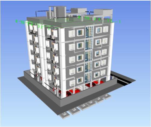 Based on the 2d drawings from AutoCAD, similar process of linking AutoCAD 2d for each level is done. In addition to it Revit arch model is linked. Both 2d drawings the 3d layout will fall in the same place giving it a baseline to model the structural element i.e., Slabs, beams, column, footing and load bearing walls are modeled. Since the features of the arch model have already been decided upon, it is quite unlikely that they will alter moving forward. Therefore, we had to align every element with the Arch model. Our objective was to provide the best solution to maintain such structure with good stability while keeping in mind that the requirement of the Arch model will mostly be about the aesthetic point of view. Fig 5 shows the structural model. Similarly, MEP (Mechanical, Electrical & Plumbing) All the three disciplines were modeled in the single model. Professionals who work in MEP engineering should use Revit MEP. Mechanical, Plumbing and electrical designs were implemented using Arch and structural model for MEP 3D modelling in Revit. Below Fig. represent the MEP Model. Fig 6 shows the MEP model