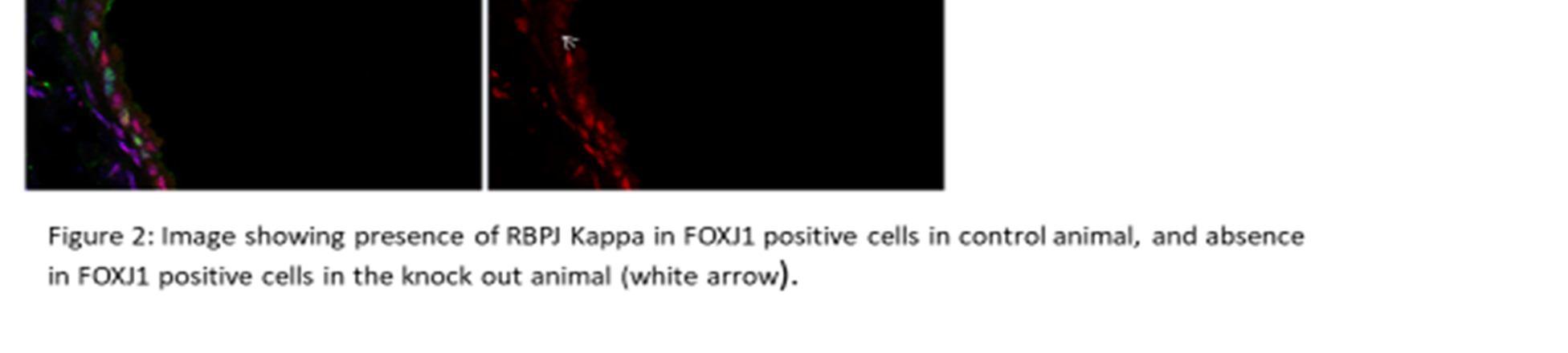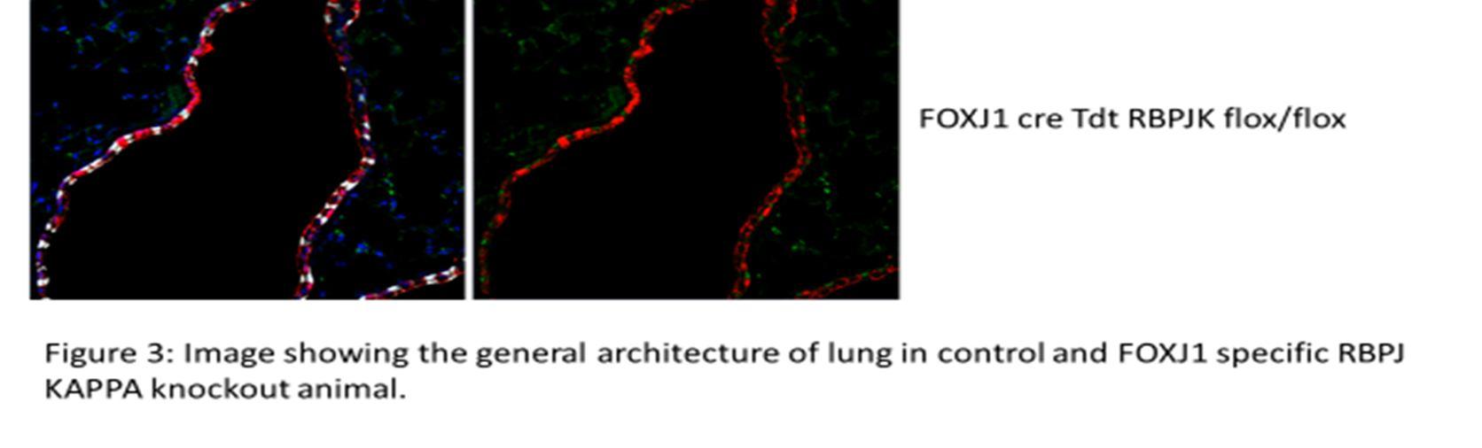 Abstract: Multiciliated cells of airway epithelium are terminally differentiated cells which are involved in the mucociliary clearance and trapping pathogens and particulate matter. Previous works have shown the transdifferentiation of secretory club cells to ciliated cells upon inhibition of Notch signaling. But, none of the existing literature reports presence or role of Notch signaling in multiciliated cells of airway epithelium. Immunostaining for Notch Intracellular Domain (NICD) revealed the presence of Notch signaling in multiciliated cells of the airway. The basic aim of this paper is to understand whether there is a role of Notch signaling in ciliated cells, by doing a cell autonomous ablation of Notch in this particular cell type using FOXJ1 CreErtm/+ RBPJkflox/flox animals. We didn’t observe any obvious change in cellular architecture of lung or any difference in club or ciliated cell numbers.