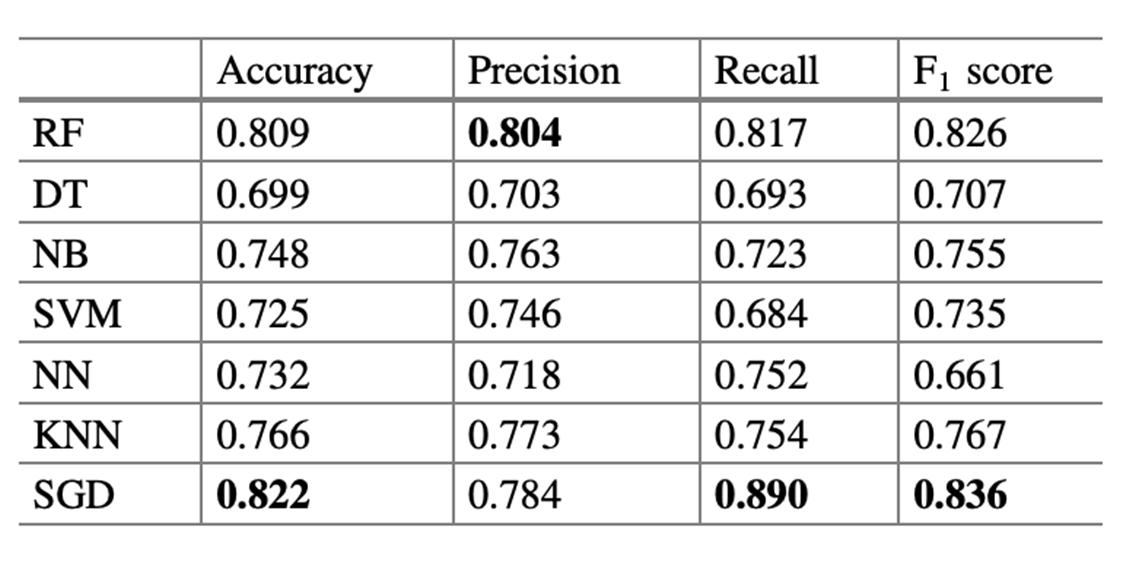 3) When we paired Word2Vec with other classifiers, we reached a high precision of 80.4 percent for the RF classifier, while the Word2Vec + SGD combination resulted in an accuracy of 82.2 percent, recall of 89.0 percent, and F1 score of 83.6 percent.