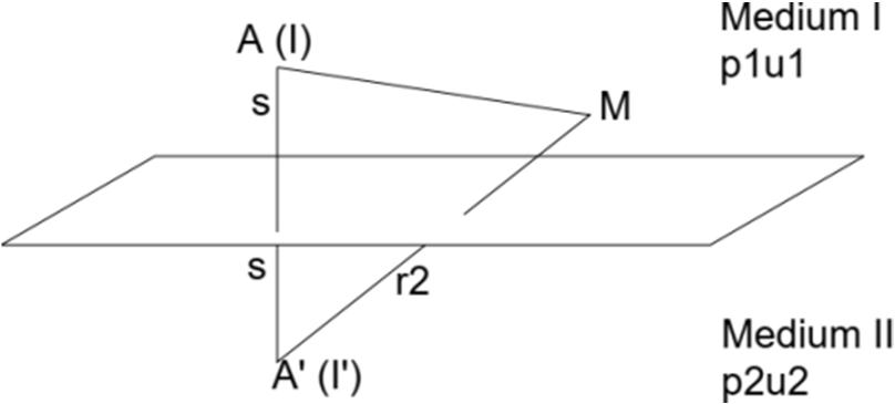 Consider now an optical analogy to the electrical problem described by figure (Fig.3). The source of current at A is replaced with a light source, and the boundary is replaced by a mirror with a reflection coefficient, K, and a transmission coefficient, I K. If the light is viewed from point M1 on the top side of the mirror, the original source is seen with its full intensity, and in addition, an image source is seen reflected from the mirror. This image source appears to be located behind the method at a distance, h, and has intensity I1.
