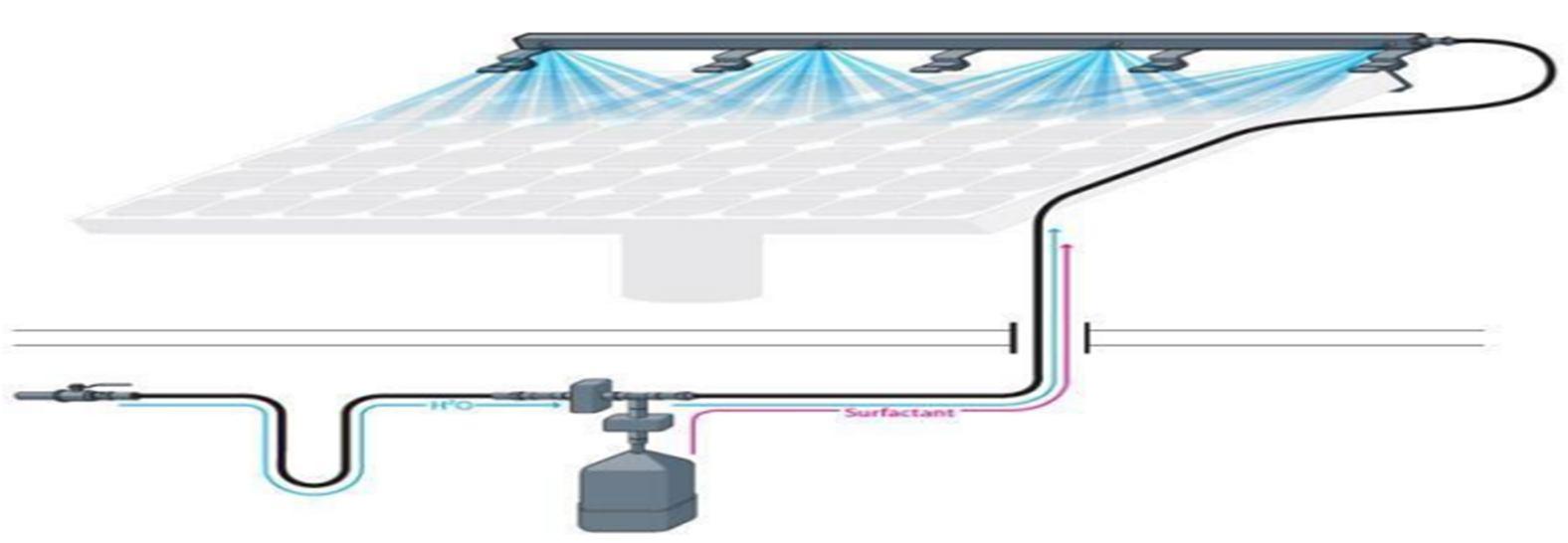 The temperature of the PV rear side served as the basis for the researchers' automated water control system. The water spray reduced the PV's temperature to almost that of the surrounding air, and it also regulates how long it sprays to clean the PV surface. The surface temperature of the headboard and the back surface were both reduced by 45.5 and 39 percent, respectively, according to the experimental study's findings. During the research period, the cleaned and cooled panel's efficiency was 11.7 percent as opposed to the unclean and uncooled panel's efficiency of 9 percent. However, Chaichan et al. (2015) suggested treating the vehicle exhaust stack on PV with alcohol or a sodium-based surfactant. The researchers did not advise using non-ionized distilled water in these situations since it resulted in a 14 percent drop in PV-producing power for six consecutive weeks of exposure. Jiang et al. (2016) created a model to predict the frequency of dust cleaning needed for PVs in arid environments. The speed of dust deposition and the correlation between the accumulation of dust density and the decline in PV performance served as the foundation for the researchers' model and actual measurement results. The research's findings indicated that when the amount of accumulated particles is around 100 mg/m3, and the power produced by the PV is degrading by about 5 percent, the PV of the study area has to be cleaned every 20 days [43].