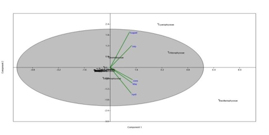 A statistical relationship between the composition of phytoplankton and the physico chemical environment variables in the surface water was done by Principal Components Analysis (PCA) in the Multivariate Statistical Package PASTA Software. In the current study Cyanophyceae and Chlorophyceae showed positive correlation with EC but showed the negative correlation with other physico chemical parameters. The EC and other physico chemical parameter showed the positive correlation with Bacillariophyceae. This was shown in the figure 3.