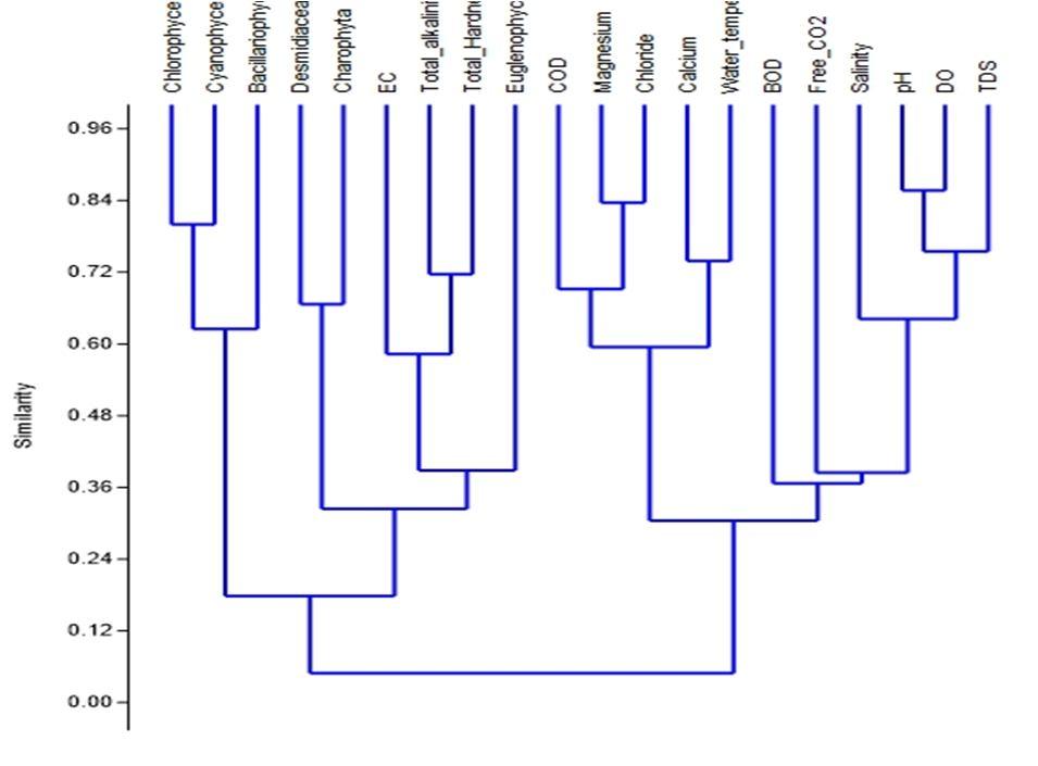 The Bray Curtis similarity index is the best tool in understanding the effect of abiotic and biotic components in the lake ecosystem. Based on the physico chemical and phytoplankton population hierarchical cluster analysis with Bray Curtis distance measure was performed. The level of significance is taken to be 0.48 and above. The outcome of Bray Curtis cluster analysis for Hadinaru lake during the period from April 2022 to August 2022 is represented in figure 2 for physicochemical and phytoplankton respectively. In the current study the highly correlated clusters were those of EC, Total hardness and Total alkalinity. The biological parameters like Chlorophyceae, Cyanophyceae and Bacillariophyceae have became one cluster and Desmidiaceae, Charophyta have became another cluster, these two clusters have showed high significance with the physico chemical cluster of EC, Total hardness and Total alkalinity.