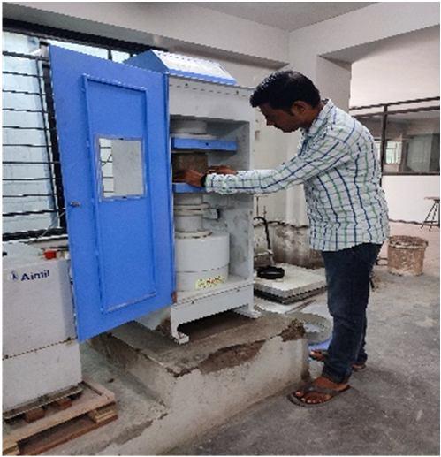 The moulds used for the preparation of samples were cubes of size (15cm x15cm x 15cm) for compressive strength testing, the beams of size (50cm x 10cm x 10cm) for flexural testing and the cylinders of size (10cm x 30cm) for split tensile strength testing. Concrete is prepared as per mix design and then poured into casting mould. While casting mould is oiled from inside for smooth surface finish and easy removal from mould. Then they are kept in water tank for required curing period and properly tested and results are noted down. For compressive test compressive test as well as split tensile strength, compressive testing machine ( CTM ) is used and for beam two point loading method is adopted.