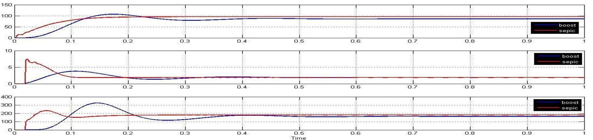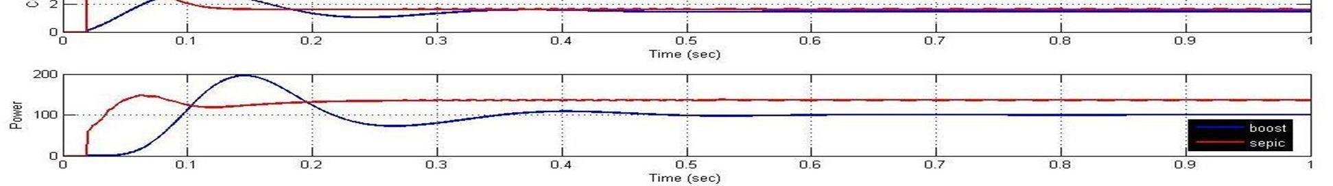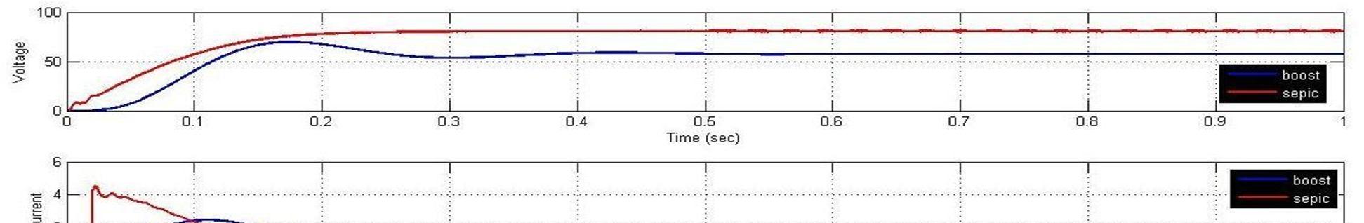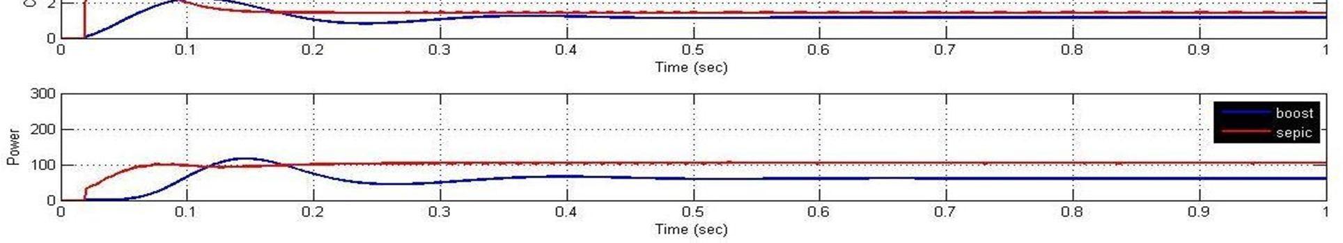 The Boost converter is set to operate at the switching frequency of 5 kHz, an inductor of 50mH and the capacitor of 2 mF [15]. The SEPIC converter is set to operate at the switching frequency of 50 kHz, two inductors Land L0, where L=L0= 5 mH and two capacitors C and C1 , where C= 2 mF and C1= 1.5mF [3]. Both the systems were simulated to feed a purely resistive load of 100 Ω.