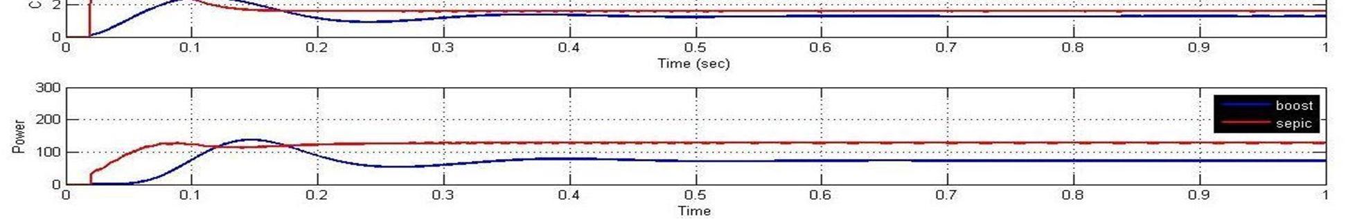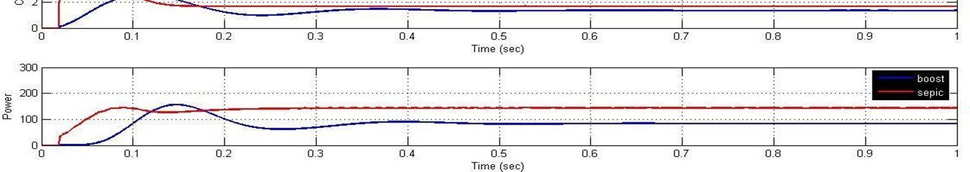 4) When T=250C and G=800 W/m2, the Boost converter output are I= 1.68 A, V= 76.4V, P= 128.9 W and Sepic converter output are I= 1.83 A, V= 92.8V, P= 169.8W, an increase of 29% in output power in Sepic w.r.t Boost.