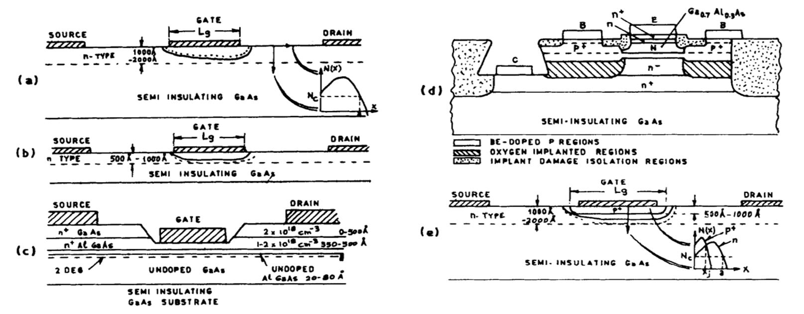 Figure 1. GaAs transistors. (a) Shows a depletion mode field effect transistor (DFET) with a threshold voltage of 0 7 V to 2.5 V, a high current capacity of0"l mA//~m, and high power dissipation of 0'25 mW/#m. (b) shows an enhancement mode field effect transistor (EFET) with a threshold voltage greater than 0 V, a low current capacity of 0"01 mA/Flm, low power dissipation of 0 01 roW/gin, and tight process controls of less than :t: 50 A,. (c) shows a high electron mobility transistor (HEMT), which is an enhancement and depletion device with a higher gate forward bias voltage of 0.7 to 0.9 V and high transconductance 450 mS/mm (300 K) to 520 mS/MM (77 K). (d) shows a heterojunction bipolar transistor (HBT) and (e) shows a junction field effect transistor (JFET) with large sidewall capacitance and tight process controls. Complementary devices are available15
