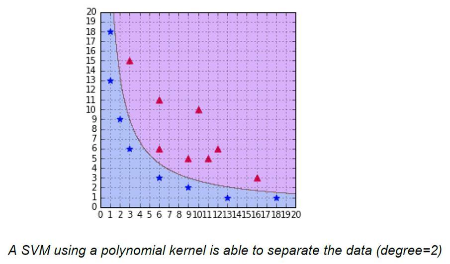 What it actually does is to create non-linear combinations of our features to lift your samples onto a higher-dimensional feature space where we can use a linear decision boundary to separate your classes It is the most used kernel in SVM classifications, the following formula explains it mathematically:
