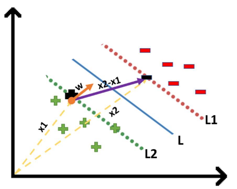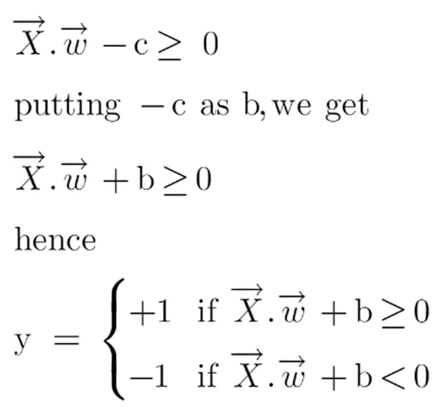 As we know, the projection of any vector or another vector is called a dot-product. Hence, we take the dot product of x and w vectors. If the dot product is greater than ‘c’ then we can say that the point lies on the right side. If the dot product is less than ‘c’ then the point is on the left side and if the dot product is equal to ‘c’ then the point lies on the decision boundary.