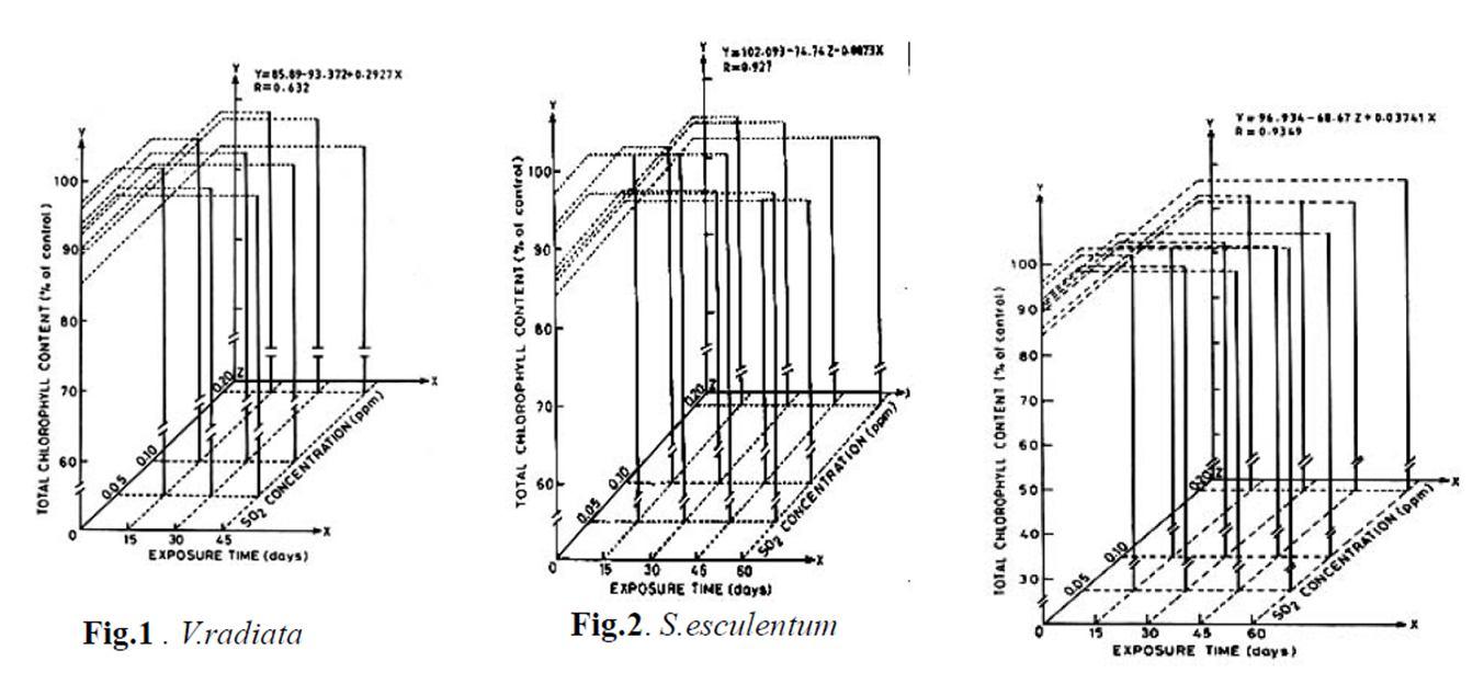 Sulfur dioxide is one of the dangerous phytotoxicants in ambient as well as under greenhouse conditions. Exposure to low concentrations of SO2 is known to induce several physiological and biochemical modifications in plants, as documented and reviewed by many investigators like Chauhan, (1989a), Darall, (1989), Varshney et al., (2009), Rai et al., (2011), Singh et al., (2012), Brahmachari and Kundu, (2017),and Lee et al., (2017) . Total leaf protein content constitutes one of the important parameters for healthy plant metabolism. Investigators like Agrawal et al., (2006), Varshney et al., (2009), Singh et al., (2012), and Lee et al., (2017) have observed a decrease in total proteins in SO2-fumigated plants in many plants Alohisen (2014) attributes this decline primarily to the free-radical induced breakdown of existing proteins, resulting in an increase in the total free amino acid content Reduced de novo synthesis of proteins is another reason for the decrease in protein content. The relationship between total protein content and the activity of antioxidant enzymes like peroxidases and superoxide dismutase (SOD) helps to explain the possible mechanisms of SO2-tolerance by many plants. Present investigation on three economically important crop plants explains the levels of total leaf proteins in relation to SO2 stress. The combined effects of SO2 dosage and exposure time have been analysed using a regression model.