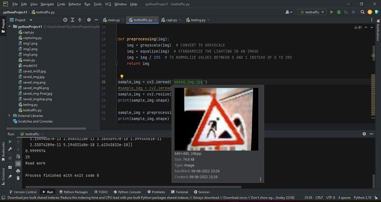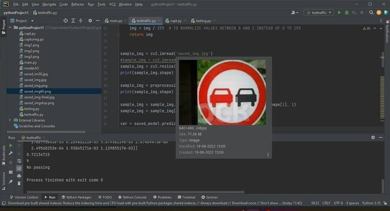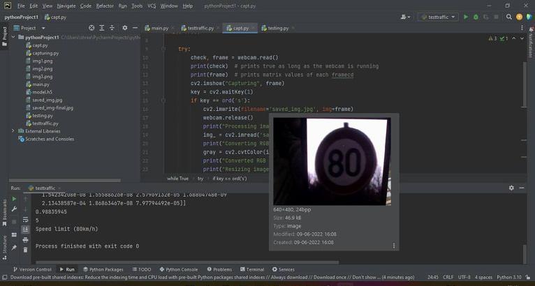 The model trained with 43 different traffic sign images is tested with unseen images which contribute to test data to obtain desired results. As soon as the python code is run, all the classes of traffic signs get installed. Since the dataset is huge, it is given in 10 epochs i.e. the whole set is divided into ten portions to train the model. Once they are all loaded and ten epochs get completed, we run the camera module program in order to activate the integrated camera of the system. Camera turns on and detects if any traffic sign is present in its scope. One such sign of 80kmph speed is used to demonstrate the performance of the model. It is brought into the range of the camera so that the sign gets detected. The digits eight and zero together bound by a circle refers to the speed limit indication board. Since 80kmph sign is one of the trained classes i.e. the model has learnt it before as a part of the supervised learning, the image gets recognised as a distinct class with the corresponding label and the same message, here ‘Speed Limit (80km/h)’ is displayed in the console and in the same way, the ‘No passing’ sign.