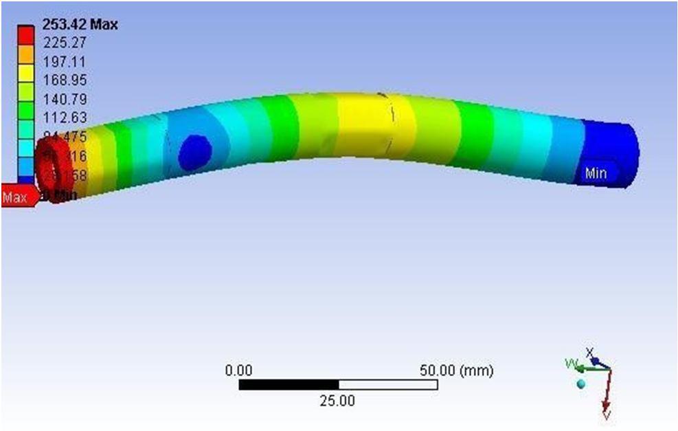 From the above plot of we can state that at the steering knuckle side tie rod possess maximum value of deformation. The reason behind this is the vibration acts on this particular tie rod part. On the other hand atbody side end we obtained zero for few part of it. The vibration frequency for this specific mode of the Tie rodis334.1Hz.
