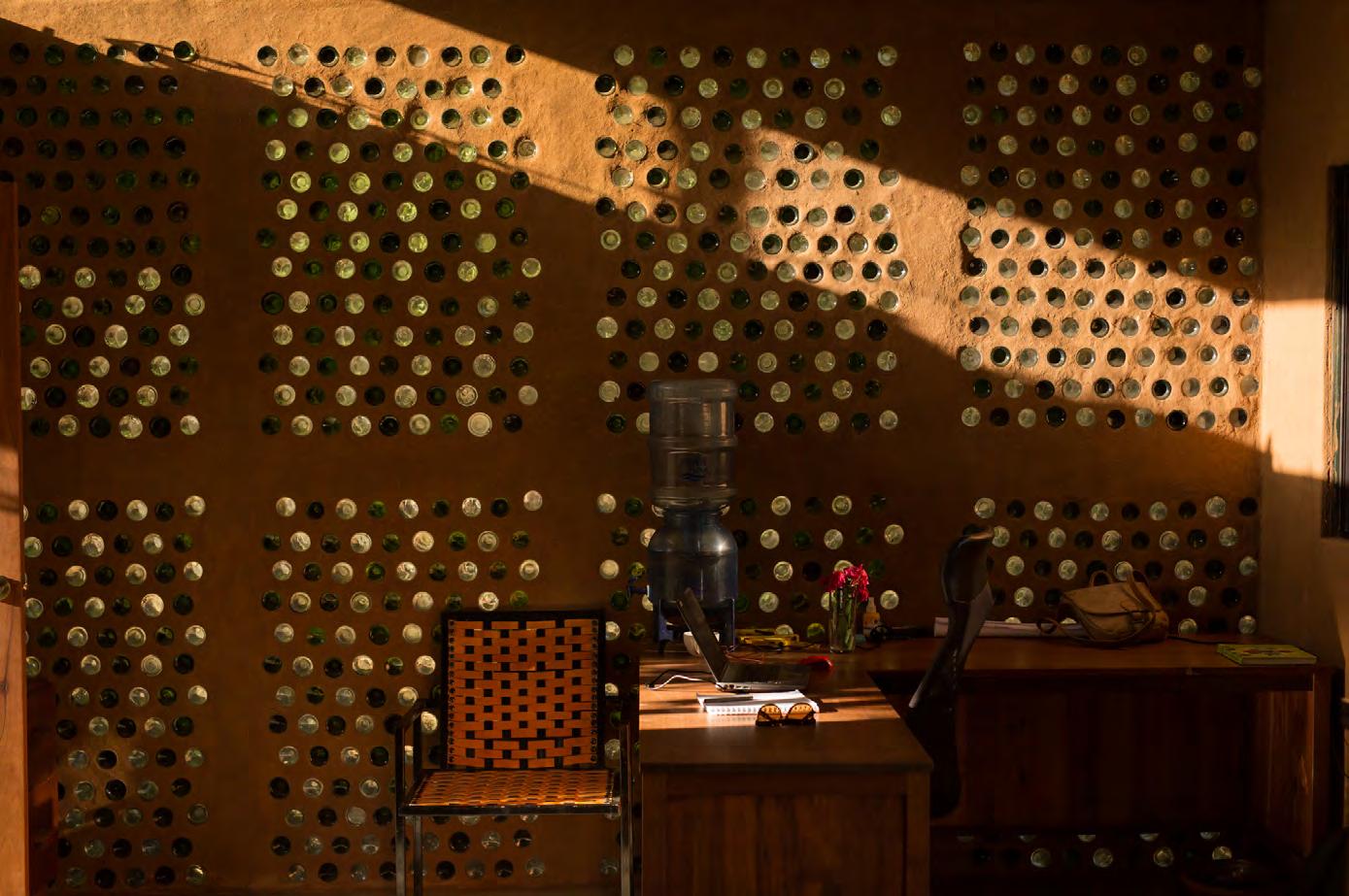 The idea was to use earth bags on the south and west walls to increase the insulation value and moderate the internal temperature. The East wall was built with a technique called ‘waddle and daub’ using adobe as the primary material. It has large windows to allow natural ventilation from the predominant winds. The North wall was made using recycled wine bottles, which allow light to pass through and create an attractive focal point.