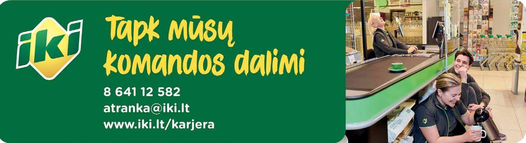 Specialių rinkinių, produktų kainos yra nurodytos eurais ir garantuojamos iki 2023 01 08 (išskyrus tuos atvejus, kai baigsis prekių atsargos ar atsiras kitų kliūčių, nepriklausomų nuo mūsų valios). Nuolaidos nesumuojamos. Nuolaidos suteikiamos kasoje. Nuolaidos netaikomos, CLEVER, HEBĖ prekės ženklu pažymėtoms prekėms, išskyrus CLEVER daržoves, akcijų ir išpardavimo prekėms. Kai kuriose IKI prekybos tinklo parduotuvėse nebuvo prekiaujama prekėmis iki akcijos, kuri skelbiama šio leidinio pasiūlymuose, pradžios. Leidinyje nurodytas prekių rūšių skaičius gali nesutapti su IKI EXPRESS ir kai kurių IKI parduotuvių turimu asortimentu. Prekių kiekis ribotas. Jei leidinyje kainos ar kita informacija apie prekes nesutampa su pateikta parduotuvėse, prašom leidinyje nurodytas kainas ir informaciją laikyti spaudos klaida. Specialūs pasiūlymai tik lojalumo kortelių turėtojams galioja kasoje pateikus IKI PREMIJA kortelę. Mieli pirkėjai, mums svarbi Jūsų nuomonė bei pasiūlymai! Nemokama infolinija 8 800 11 454 (darbo dienomis nuo 8:00 iki 17:00 val.), el. paštas atsiliepimai@iki.lt. Alytus: Naujoji g. 2c. Vilnius: Žirmūnų g. 2, Fabijoniškių g. 2a, Viršuliškių g. 40. Kaunas: P. Lukšio g. 60. Klaipėda: Taikos pr. 28, Herkaus Manto g. 90 - 1, Šaulių g. 11. Šiauliai: Vilniaus g. 220, Gardino g. 2 - 2. Šilutė: Dariaus ir Girėno g. 11. Mažeikiai: Sedos g. 18. Prekes, pažymėtas A lygiu, rasite šiose IKI parduotuvėse: Prekes, pažymėtas A(1) lygiu, rasite šiose IKI parduotuvėse: Alytus: Naujoji g. 2c. Avižieniai: Senasis Ukmergės kelias 8. Druskininkai: Čiurlionio g. 107. Kaunas: Baltijos g. 59 - 1, Kovo 11-osios g. 22, P. Lukšio g. 60, Savanorių pr. 375. *Įprasta kaina taikoma tik leidinyje nurodytoms prekėms. Likusių rūšių prekėms įprasta kaina parduotuvėse gali skirtis nuo nurodytų įprastų kainų leidinyje. Klaipėda: Herkaus Manto g. 90-1, Taikos pr. 28, Laukininkų g. 19-1. Šiauliai: Gardino g. 2 - 2, Vilniaus g. 220 - 1. Šilutė: Dariaus ir Girėno g. 11. Riešė: Molėtų g. 13-1. Vilnius: Nemenčinės pl. 2, Didlaukio g. 80a, Fabijoniškių g. 2a, Viršuliškių g. 40, Mindaugo g. 25, Pilaitės pr. 42, Šeškinės g. 32, Žirmūnų g. 2, Bajorų kel. 4, Visalaukio g.1. 39 0 -30% -25% -20% -25% Lašišai ir jos gaminiams 1 kg, 9 rūšių (pasiūlymas galioja tik tose IKI parduotuvėse, kuriose yra šviežios žuvies ledo vitrina) Tualetiniam popieriui, popieriniams rankšluosčiams ir servetėlėms Įvairių rūšių Ir IKI EXPRESS Bulvių ir kukurūzų traškučiams Įvairių rūšių Ir IKI EXPRESS KREKENAVOS MĖSOS gaminiams Įvairių rūšių Ir IKI EXPRESS Geriamiesiems jogurtams, pieno gėrimams Įvairių rūšių Ir IKI EXPRESS Sultims, sulčių gėrimams ir nektarams Įvairių rūšių (taros užstato vertė į gėrimo kainą neįskaičiuota) Ir IKI EXPRESS -30% -30% Tepamiesiems ir lydytiems sūriams Įvairių rūšių Ir IKI EXPRESS -20% -20% -20% -40% -20% Aliejui Įvairių rūšių Sausiems pusryčiams ir javainių batonėliams Įvairių rūšių Ir IKI EXPRESS PAGAMINTA IKI duonai Įvairių rūšių Ir IKI EXPRESS IKI Fasuotai šviežiai mėsai Įvairių rūšių Ir IKI EXPRESS CLEVER sveriamos bulvės 1 kg Nuo ketvirtadienio iki sekmadienio 01 05 – 01 08 SAUSĮ LENGVIAU, KAI SAVAITGALĮ PIGIAU!