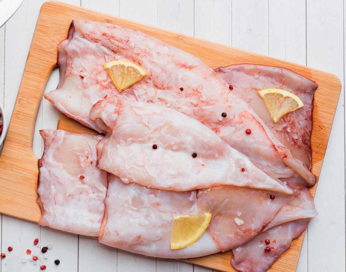 Atitirpinta skraidkalmarių filė be odos 1 kg (pasiūlymas galioja tik tose parduotuvėse, kuriose yra šviežios žuvies ledo vitrina).