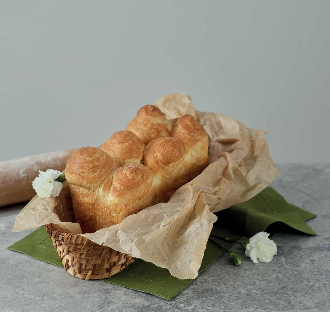 Unikalios formos duonelė iš sluoksniuotos mielinės sviestinių ragelių tešlos, viduje lengva kaip oras, išorėje sluoksniuota ir traški.