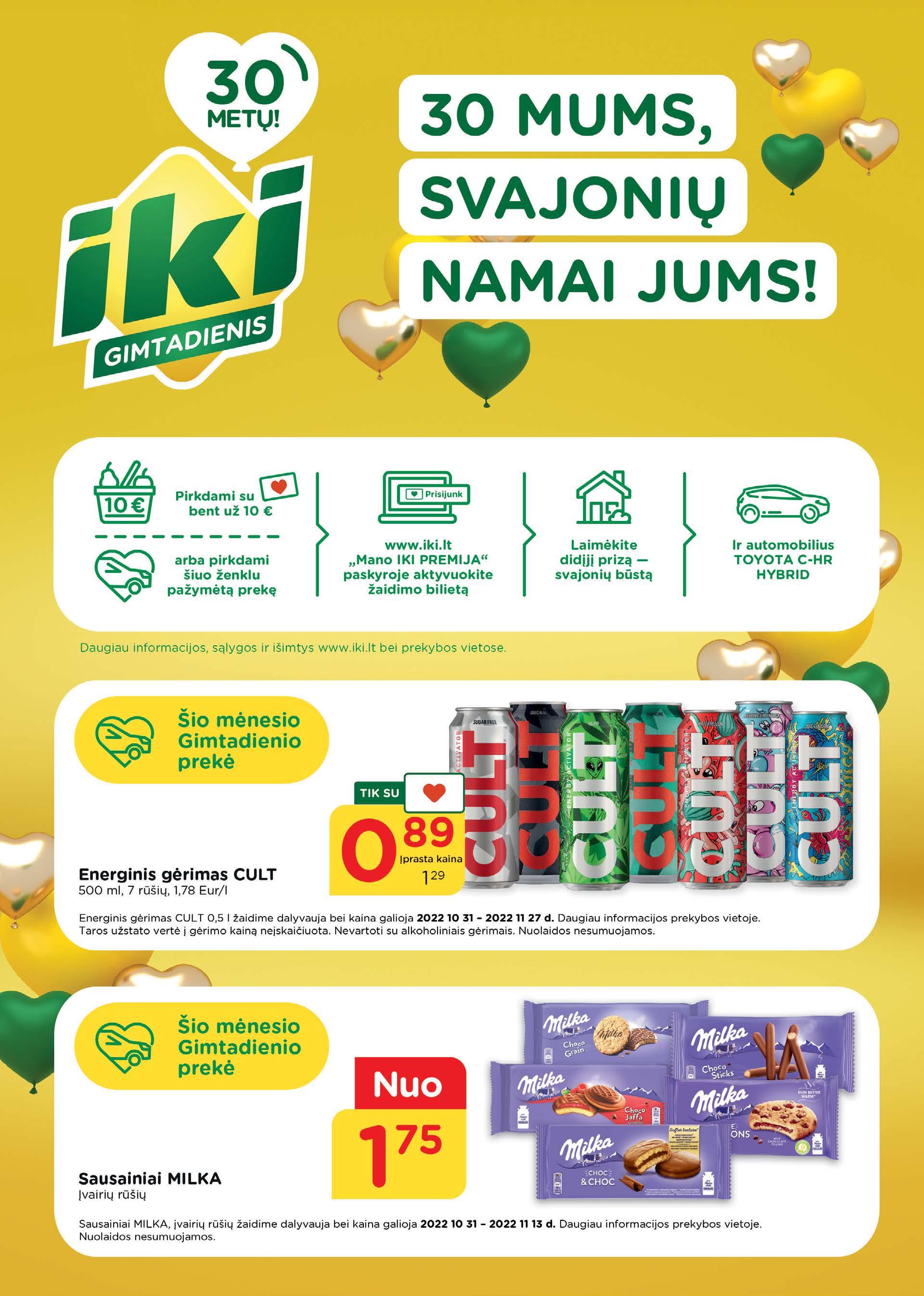 Specialių rinkinių, produktų kainos yra nurodytos eurais ir garantuojamos iki 2022 11 06 (išskyrus tuos atvejus, kai baigsis prekių atsargos ar atsiras kitų kliūčių, nepriklausomų nuo mūsų valios). Nuolaidos nesumuojamos. Nuolaidos suteikiamos kasoje. Nuolaidos netaikomos, CLEVER, HEBĖ prekės ženklu pažymėtoms prekėms, išskyrus CLEVER daržoves, akcijų ir išpardavimo prekėms. Kai kuriose IKI prekybos tinklo parduotuvėse nebuvo prekiaujama prekėmis iki akcijos, kuri skelbiama šio leidinio pasiūlymuose, pradžios. Leidinyje nurodytas prekių rūšių skaičius gali nesutapti su IKI EXPRESS ir kai kurių IKI parduotuvių turimu asortimentu. Prekių kiekis ribotas. Jei leidinyje kainos ar kita informacija apie prekes nesutampa su pateikta parduotuvėse, prašom leidinyje nurodytas kainas ir informaciją laikyti spaudos klaida. Specialūs pasiūlymai tik lojalumo kortelių turėtojams galioja kasoje pateikus IKI PREMIJA kortelę. Mieli pirkėjai, mums svarbi Jūsų nuomonė bei pasiūlymai! Nemokama infolinija 8 800 11 454 (darbo dienomis nuo 8:00 iki 17:00 val.), el. paštas atsiliepimai@iki.lt. Nuo ketvirtadienio iki sekmadienio 30 MUMS –PUIKIOS SAVAITGALIO NUOLAIDOS JUMS 11 03 – 11 06 Alytus: Naujoji g. 2c. Vilnius: Žirmūnų g. 2, Fabijoniškių g. 2a, Viršuliškių g. 40. Kaunas: P. Lukšio g. 60. Klaipėda: Taikos pr. 28, Herkaus Manto g. 90 - 1, Šaulių g. 11; Šiauliai: Vilniaus g. 220, Gardino g. 2 - 2. Šilutė: Dariaus ir Girėno g. 11. Mažeikiai: Sedos g. 18. Prekes, pažymėtas A lygiu, rasite šiose IKI parduotuvėse: Prekes, pažymėtas A(1) lygiu, rasite šiose IKI parduotuvėse: Alytus: Naujoji g. 2C., Kaunas: P. Lukšio g. 60; Kovo 11-osios g. 22. Klaipėda: Laukininkų g. 19-1; Taikos pr. 28; H. Manto g. 90-1. Šiauliai: Vilniaus g. 220-1, Gardino g. 2-2. Šilutė: Dariaus ir Girėno g. 11. Vilnius: Žirmūnų g. 2, Viršuliškių g. 40; Fabijoniškių g. 2A; Didlaukio g. 80A-101; Šeškinės g. 32; Molėtų g. 13; Mindaugo g. 25; Nemenčinės pl. 2; Bajorų kel. 4; Visalaukio g. 1. *Įprasta kaina taikoma tik leidinyje nurodytoms prekėms. Likusių rūšių prekėms įprasta kaina parduotuvėse gali skirtis nuo nurodytų įprastų kainų leidinyje. -20% -25% -25% -40%-30% -20% -20%-20% -30% Produktams ALPRO Įvairių rūšių Ir IKI EXPRESS Bulvių ir kukurūzų traškučiams Įvairių rūšių Ir IKI EXPRESS Kūdikių maistui ir priežiūros priemonėms, įvairių rūšių (nuolaida netaikoma pradinio ir specializuoto maitinimo pieno mišiniams) Ir IKI EXPRESS Skalbimo chemijai Įvairių rūšių (nuolaida netaikoma valymo chemijai) Ir IKI EXPRESS Gazuotam ir negazuotam vandeniui Įvairių rūšių (taros užstato vertė į gėrimo kainą neįskaičiuota) Ir IKI EXPRESS Miltams, miltų mišiniams Įvairių rūšių Batonams ir SUMUŠTINIŲ duonai Įvairių rūšių Ir IKI EXPRESS Šaltai ir karštai rūkytiems mėsos gaminiams Įvairių rūšių Ir IKI EXPRESS Mocarelos, maskarponės ir rikotos sūriams Įvairių rūšių -40% Atvėsintai lašišai ir jos gaminiams 1 kg, 6 rūšių (pasiūlymas galioja tik tose IKI parduotuvėse, kuriose yra šviežios žuvies ledo vitrina) IKI fasuotai šviežiai mėsai Įvairių rūšių Ir IKI EXPRESS -20% CLEVER sveriamos morkos 1 kg 290