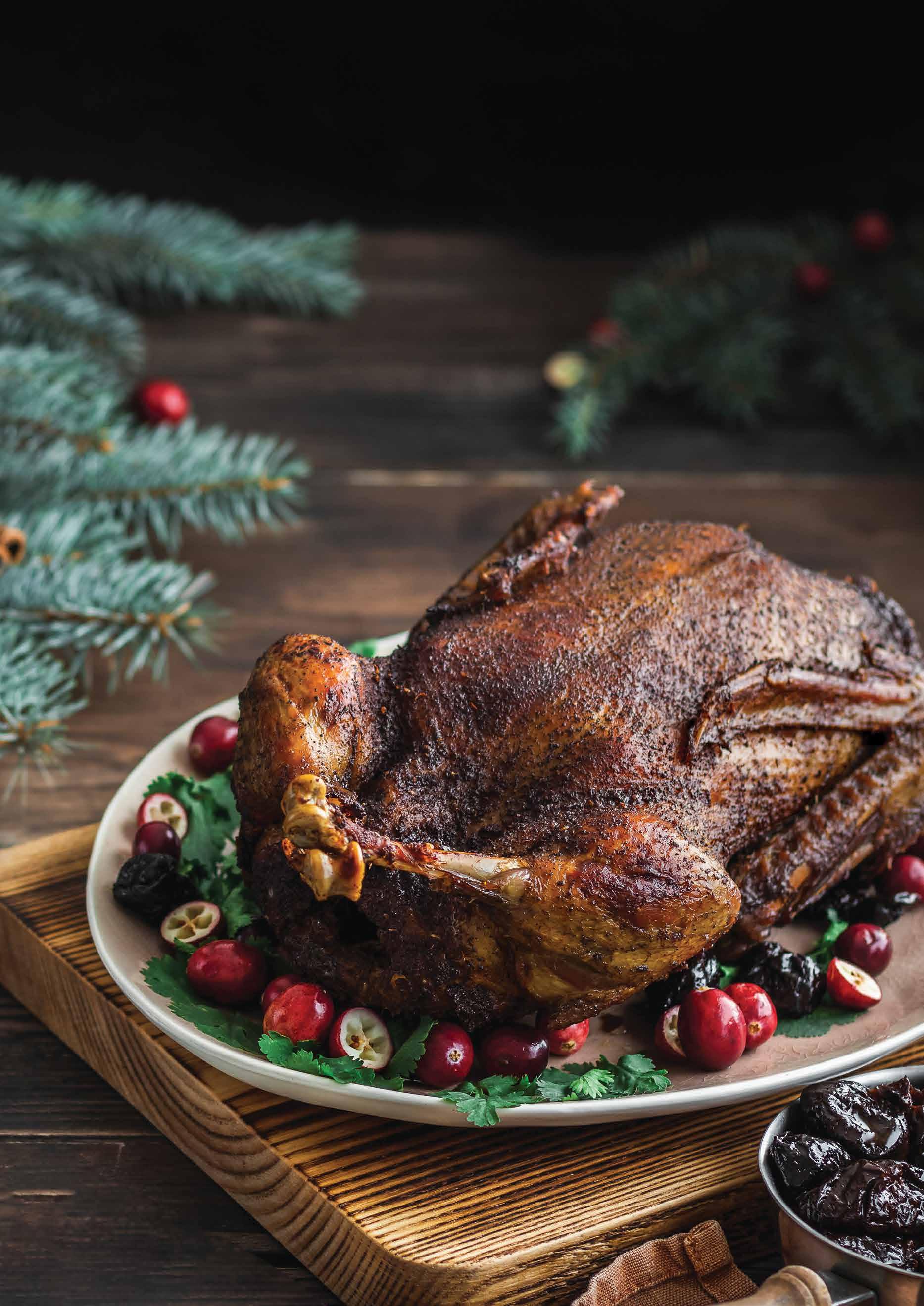 • 1 PEKINO anties • 300 ml vandens • 1 kubelio ekologiško „Bio Village“ daržovių sultinio su prieskoniniais augalais • 300 g džiovintų slyvų • 1 v. š. cinamono • 4 a. š. rudojo cukraus • 60 ml balzaminio acto • žiupsnelio džiovintų kalendrų • 1 a. š. druskos • žiupsnelio maltų juodųjų pipirų