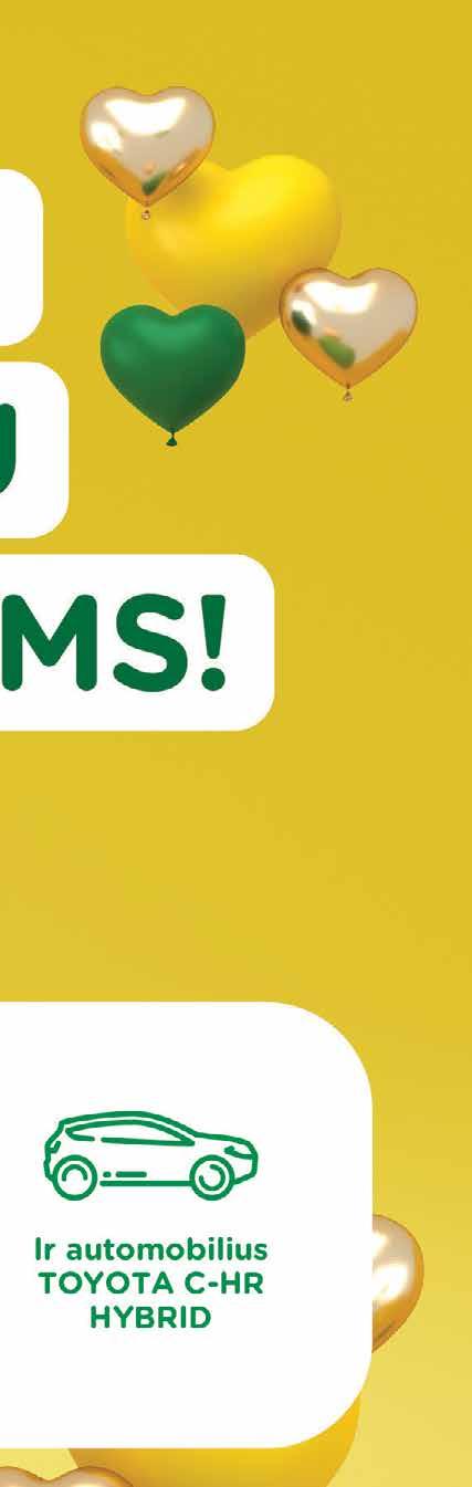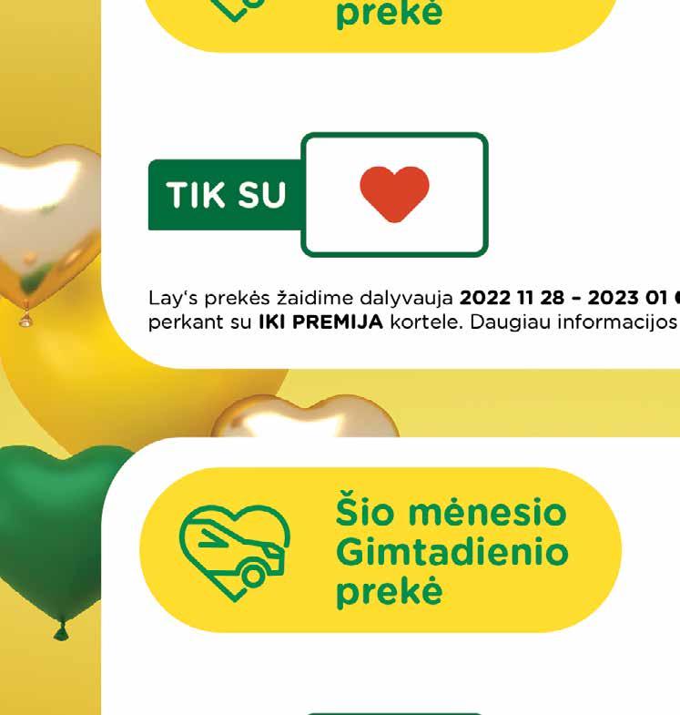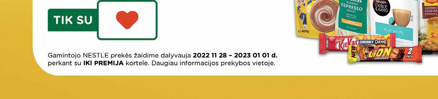 Specialių rinkinių, produktų kainos yra nurodytos eurais ir garantuojamos iki 2022 12 26 (išskyrus tuos atvejus, kai baigsis prekių atsargos ar atsiras kitų kliūčių, nepriklausomų nuo mūsų valios). Nuolaidos nesumuojamos. Nuolaidos suteikiamos kasoje. Nuolaidos netaikomos, CLEVER, HEBĖ prekės ženklu pažymėtoms prekėms, išskyrus CLEVER daržoves, akcijų ir išpardavimo prekėms. Kai kuriose IKI prekybos tinklo parduotuvėse nebuvo prekiaujama prekėmis iki akcijos, kuri skelbiama šio leidinio pasiūlymuose, pradžios. Leidinyje nurodytas prekių rūšių skaičius gali nesutapti su IKI EXPRESS ir kai kurių IKI parduotuvių turimu asortimentu. Prekių kiekis ribotas. Jei leidinyje kainos ar kita informacija apie prekes nesutampa su pateikta parduotuvėse, prašom leidinyje nurodytas kainas ir informaciją laikyti spaudos klaida. Specialūs pasiūlymai tik lojalumo kortelių turėtojams galioja kasoje pateikus IKI PREMIJA kortelę. Mieli pirkėjai, mums svarbi Jūsų nuomonė bei pasiūlymai! Nemokama infolinija 8 800 11 454 (darbo dienomis nuo 8:00 iki 17:00 val.), el. paštas atsiliepimai@iki.lt. Alytus: Naujoji g. 2c. Vilnius: Žirmūnų g. 2, Fabijoniškių g. 2a, Viršuliškių g. 40. Kaunas: P. Lukšio g. 60. Klaipėda: Taikos pr. 28, Herkaus Manto g. 90 - 1, Šaulių g. 11. Šiauliai: Vilniaus g. 220, Gardino g. 2 - 2. Šilutė: Dariaus ir Girėno g. 11. Mažeikiai: Sedos g. 18. Prekes, pažymėtas A lygiu, rasite šiose IKI parduotuvėse: Prekes, pažymėtas A(1) lygiu, rasite šiose IKI parduotuvėse: Alytus: Naujoji g. 2c. Avižieniai: Senasis Ukmergės kelias 8. Druskininkai: Čiurlionio g. 107. Kaunas: Baltijos g. 59 - 1, Kovo 11-osios g. 22, P. Lukšio g. 60, Savanorių pr. 375. *Įprasta kaina taikoma tik leidinyje nurodytoms prekėms. Likusių rūšių prekėms įprasta kaina parduotuvėse gali skirtis nuo nurodytų įprastų kainų leidinyje. Klaipėda: Herkaus Manto g. 90-1, Taikos pr. 28, Laukininkų g. 19-1. Šiauliai: Gardino g. 2 - 2, Vilniaus g. 220 - 1. Šilutė: Dariaus ir Girėno g. 11. Riešė: Molėtų g. 13-1. Vilnius: Nemenčinės pl. 2, Didlaukio g. 80a, Fabijoniškių g. 2a, Viršuliškių g. 40, Mindaugo g. 25, Pilaitės pr. 42, Šeškinės g. 32, Žirmūnų g. 2, Bajorų kel. 4, Visalaukio g.1. 99 0 Atšaldyti atlantinių lašišų pjausniai, 1 kg (pasiūlymas galioja tik tose IKI parduotuvėse, kuriose yra šviežios žuvies ledo vitrina) Negazuotas natūralus mineralinis vanduo AKVILĖ 1,5 l, 0.69 Eur/vnt. (taros užstato vertė į gėrimo kainą neįskaičiuota) Ir IKI EXPRESS Kavos pupelėms Įvairių rūšių Ir IKI EXPRESS 069 1+1 Konservuotoms daržovėms BONDUELLE Įvairių rūšių Valymo chemijai Įvairių rūšių (netaikoma indų plovimo ir skalbimo priemonėms) Ir IKI EXPRESS Gyvūnų prekėms Įvairių rūšių Ir IKI EXPRESS Vytinta ispaniška dešra FUETEC 170 g, 3,29 Eur/vnt. Ir IKI EXPRESS -40% -50% -40% -40% -30% 29 3 1+1 Mocarelos, maskarponės ir rikotos sūriams 9 rūšių Ir IKI EXPRESS -20% -20% PAGAMINTA IKI pyragams Įvairių rūšių Ir IKI EXPRESS Baltieji greipfrutai POMELO, 1 kg Ir IKI EXPRESS Maltai kavai PAULIG 100 g, 250 g, 500 7 rūšių 99 8 -43% 15 99 Majonezas HELLMANN’S TRADITIONAL SALAD 625 ml, 4,14 Eur/l 59 2 -50% 5 19 VISĄ SAVAITĘ ŠVENTINĖS NUOLAIDOS JUMS 2022 12 19 – 12 26