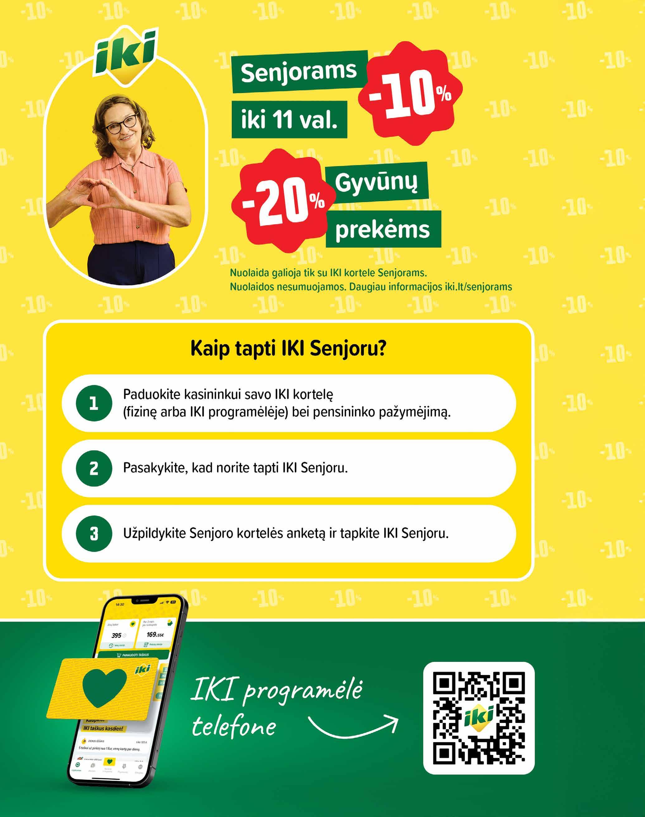*Leidinyje nurodyta kilogramo ar litro kaina galioja tik perkant prekę su IKI lojalumo kortele. Prekių kiekis ribotas. Kai kurios prekės gali būti išparduotos pirmąją pasiūlymo dieną arba atsirasti kitų kliūčių, nepriklausomų nuo IKI valios, kada baigsis prekių atsargos. Nuolaidos nesumuojamos. Nuolaidos netaikomos CLEVER, HEBĖ, DOUCEUR prekių ženklu pažymėtoms prekėms, išskyrus CLEVER daržoves, akcijų ir išpardavimo prekėms, IKI GO! parduotuvėse. Skirtingose parduotuvėse (IKI, IKI Express) prekių ir jų rūšių skaičius gali skirtis. IKI Express parduotuvių kainolapiuose įprasta prekės kaina, ir/ar procentinis akcijos, ir/ar ar sutaupymo dydis gali skirtis nuo leidinyje nurodytų, tačiau galutinė prekės kaina atitiks šio leidinio pasiūlymus, taikomus IKI Express parduotuvėse. Jei leidinyje kainos ar kita informacija apie prekes nesutampa su pateikta parduotuvėse, prašome leidinyje nurodytas kainas ir informaciją laikyti spaudos klaida. Mieli pirkėjai, mums svarbi Jūsų nuomonė bei pasiūlymai! Nemokama infolinija 0 800 11 454 (visą parą), el.p. atsiliepimai@iki.lt.