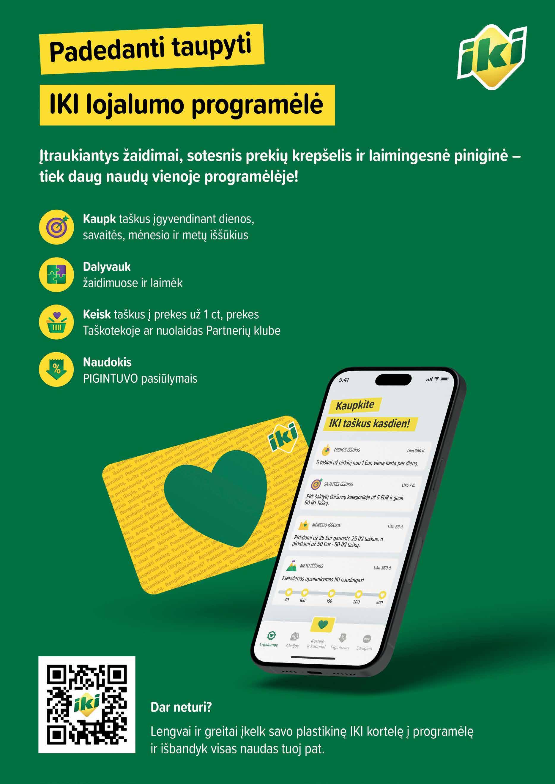 *Leidinyje nurodyta kilogramo ar litro kaina galioja tik perkant prekę su IKI lojalumo kortele. Prekių kiekis ribotas. Kai kurios prekės gali būti išparduotos pirmąją pasiūlymo dieną arba atsirasti kitų kliūčių, nepriklausomų nuo IKI valios, kada baigsis prekių atsargos. Nuolaidos nesumuojamos. Nuolaidos netaikomos CLEVER, HEBĖ, DOUCEUR prekių ženklu pažymėtoms prekėms, išskyrus CLEVER daržoves, akcijų ir išpardavimo prekėms, IKI GO! parduotuvėse. Skirtingose parduotuvėse (IKI, IKI Express) prekių ir jų rūšių skaičius gali skirtis. IKI Express parduotuvių kainolapiuose įprasta prekės kaina, ir/ar procentinis akcijos, ir/ar ar sutaupymo dydis gali skirtis nuo leidinyje nurodytų, tačiau galutinė prekės kaina atitiks šio leidinio pasiūlymus, taikomus IKI Express parduotuvėse. Jei leidinyje kainos ar kita informacija apie prekes nesutampa su pateikta parduotuvėse, prašome leidinyje nurodytas kainas ir informaciją laikyti spaudos klaida. Mieli pirkėjai, mums svarbi Jūsų nuomonė bei pasiūlymai! Nemokama infolinija 8 800 11 454 (darbo dienomis nuo 8:00 iki 17:00 val.), el.p. atsiliepimai@iki.lt.