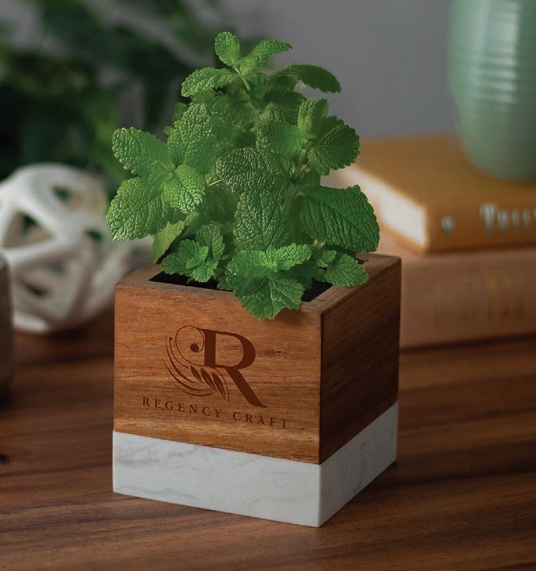 Includes: 1 Seed Packet (Specify on Order), 2 Coconut Coir Pellets, and 1 Acacia Wood & Marble Planter