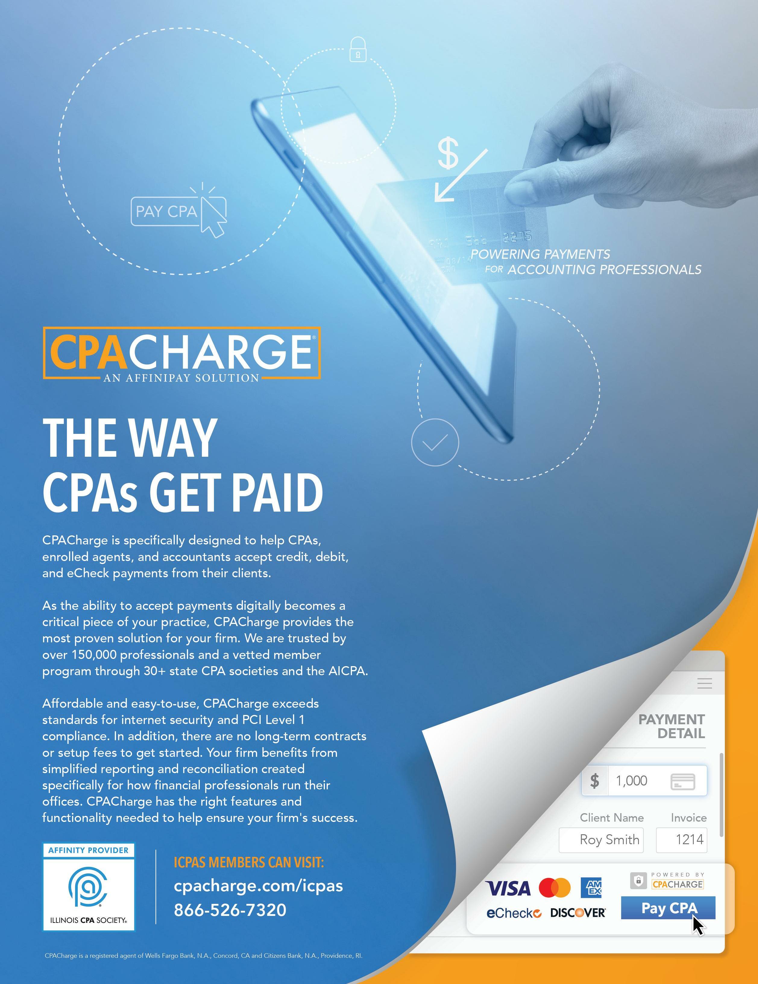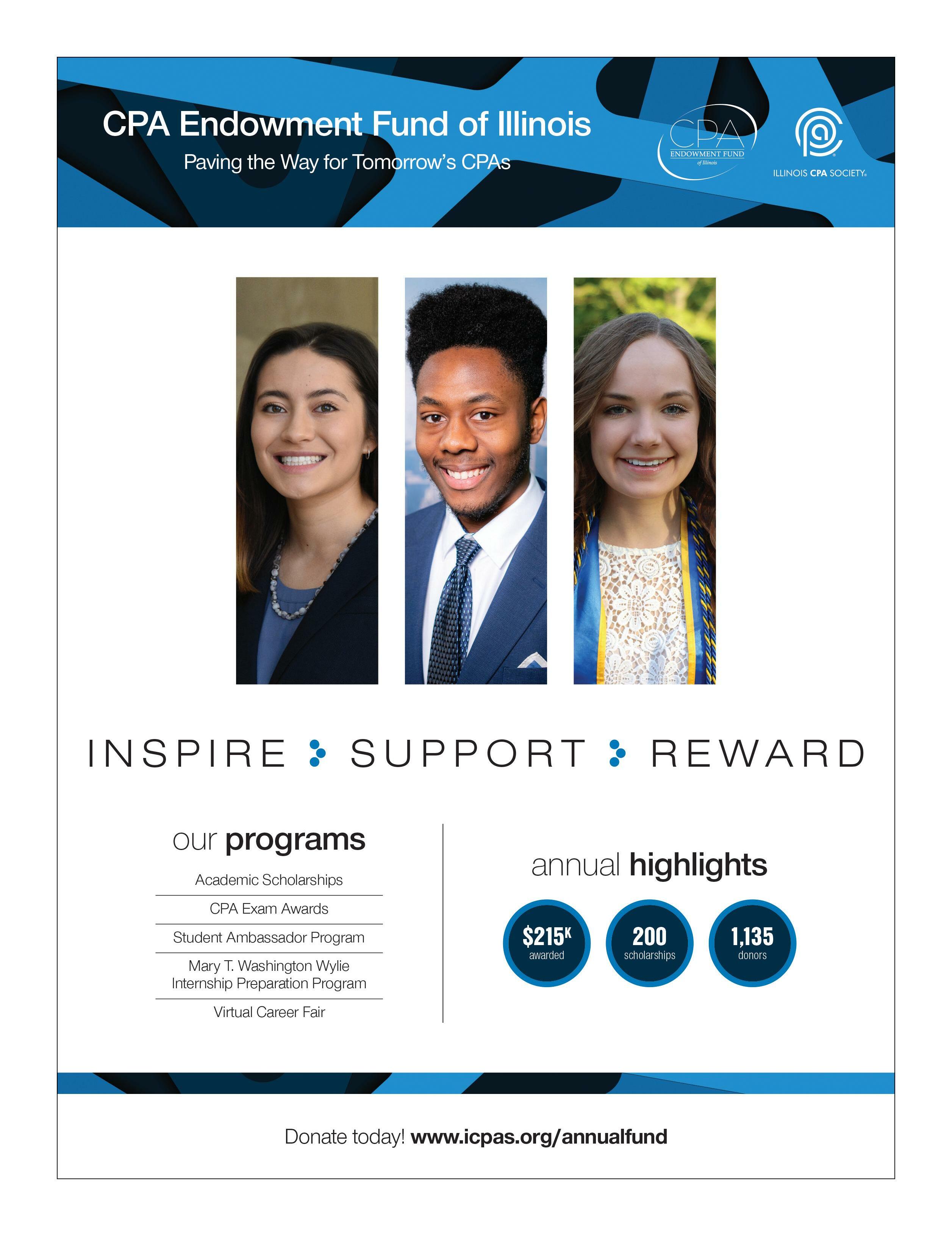 Insight is the magazine of the Illinois CPA Society Statements or articles of opinion appearing in Insight are not necessarily the views of the Illinois CPA Society The materials and information contained within Insight are offered as information only and not as practice, financial, accounting, legal or other professional advice Readers are strongly encouraged to consult with an appropriate professional advisor before acting on the information contained in this publication It is Insight ’ s policy not to knowingly accept advertising that discriminates on the basis of race, religion, sex, age or origin The Illinois CPA Society reserves the right to reject paid advertising that does not meet Insight ’ s qualifications or that may detract from its professional and ethical standards The Illinois CPA Society does not necessarily endorse the non-Society resources, services or products that may appear or be referenced within Insight, and makes no representation or warranties about the products or services they may provide or their accuracy or claims The Illinois CPA Society does not guarantee delivery dates for Insight The Society disclaims all warranties, express or implied, and assumes no responsibility whatsoever for damages incurred as a result of delays in delivering Insight Insight (ISSN1053-8542) is published four times